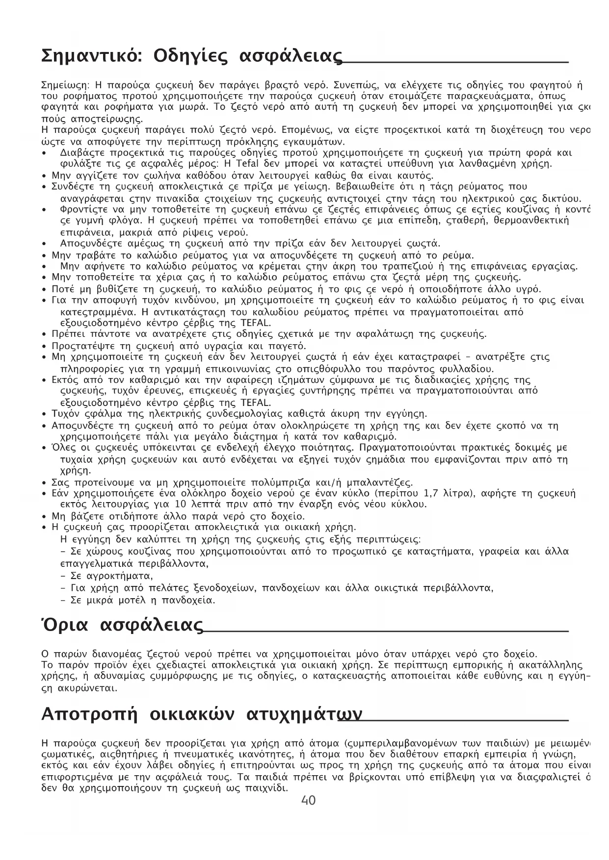 - Η συσκευή σασ ροορίζεται αοκλειστικά για οικιακή χρήση. Η εγγύηση δεν καλύτει τη χρήση τησ συσκευήσ στισ εξήσ εριτώσεισ: - Σε χώρουσ κουζίνασ ου χρησιµοοιούνται αό το ροσωικό σε καταστήµατα, γραφεία και άλλα εαγγελµατικά εριβάλλοντα, - Σε αγροκτήµατα, - Για χρήση αό ελάτεσ ξενοδοχείων, ανδοχείων και άλλα οικιστικά εριβάλλοντα, - Σε µικρά µοτέλ η ανδοχεία. Όρια ασφάλειας Ο αρών διανοµέασ ζεστού νερού ρέει να χρησιµοοιείται µόνο όταν υάρχει νερό στο δοχείο. Το αρόν ροόν έχει σχεδιαστεί αοκλειστικά για οικιακή χρήση. Σε ερίτωση εµορικήσ ή ακατάλληλησ χρήσησ, ή αδυναµίασ συµµόρφωσησ µε τισ οδηγίεσ, ο κατασκευαστήσ αοοιείται κάθε ευθύνησ και η εγγύη- ση ακυρώνεται. Α'οτρο'ή οικιακών ατυχηµάτων Η αρούσα συσκευή δεν ροορίζεται για χρήση αό άτοµα (συµεριλαµβανοµένων των αιδιών) µε µειωµένεσ σωµατικέσ, αισθητήριεσ ή νευµατικέσ ικανότητεσ, ή άτοµα ου δεν διαθέτουν εαρκή εµειρία ή γνώση, εκτόσ και εάν έχουν λάβει οδηγίεσ ή ειτηρούνται ωσ ροσ τη χρήση τησ συσκευήσ αό τα άτοµα ου είναι ειφορτισµένα µε την ασφάλειά τουσ. Τα αιδιά ρέει να βρίσκονται υό είβλεψη για να διασφαλιστεί ότι δεν θα χρησιµοοιήσουν τη συσκευή ωσ αιχνίδι.