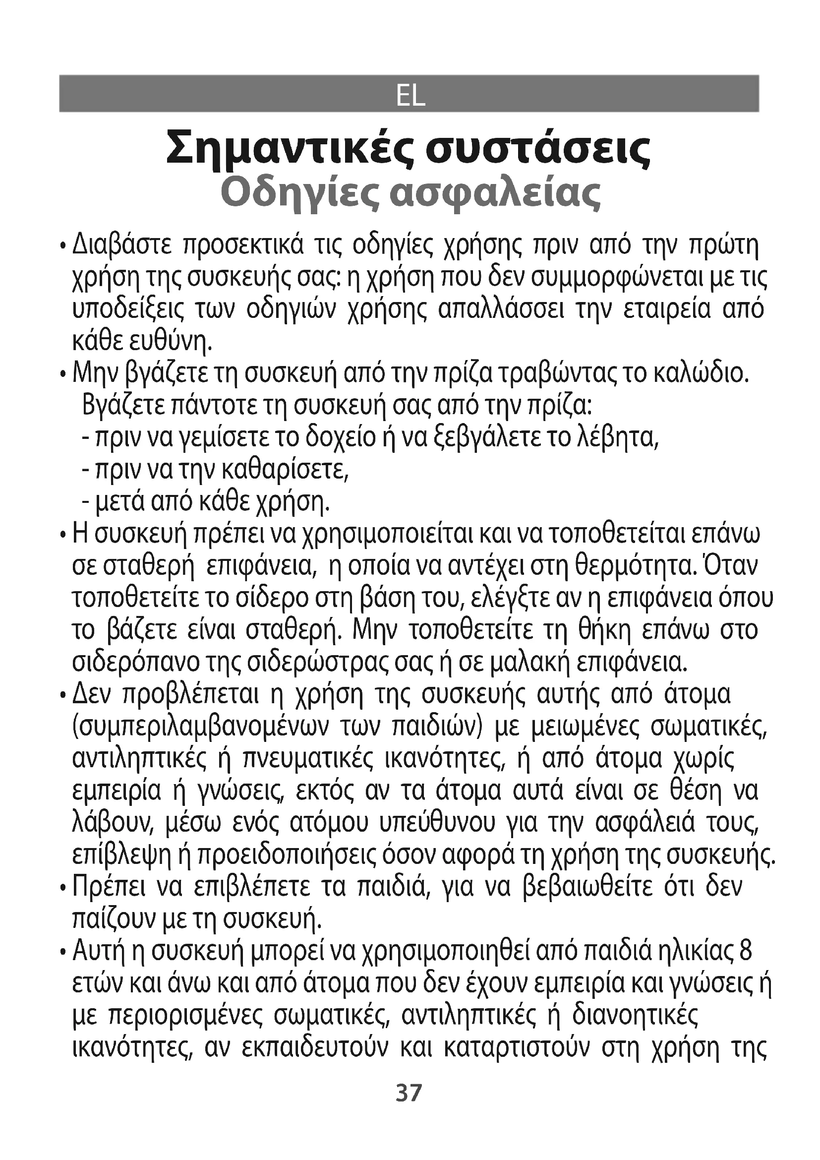 συσκευής με ασφαλή τρόπο και γνωρίζουν τους κινδύνους που διατρέχουν. Τα παιδιά δεν πρέπει να παίζουν με τη συσκευή. Ο καθαρισμός και η συντήρηση από το χρήστη δεν πρέπει να πραγματοποιείται από παιδιά, παρά μόνο αν έχουν ηλικία από 8 ετών και άνω και επιβλέπονται. Διατηρείτε τη συσκευή και το καλώδιό της σε μέρος που να μην τη φτάνουν παιδιά μικρότερα από 8 ετών.