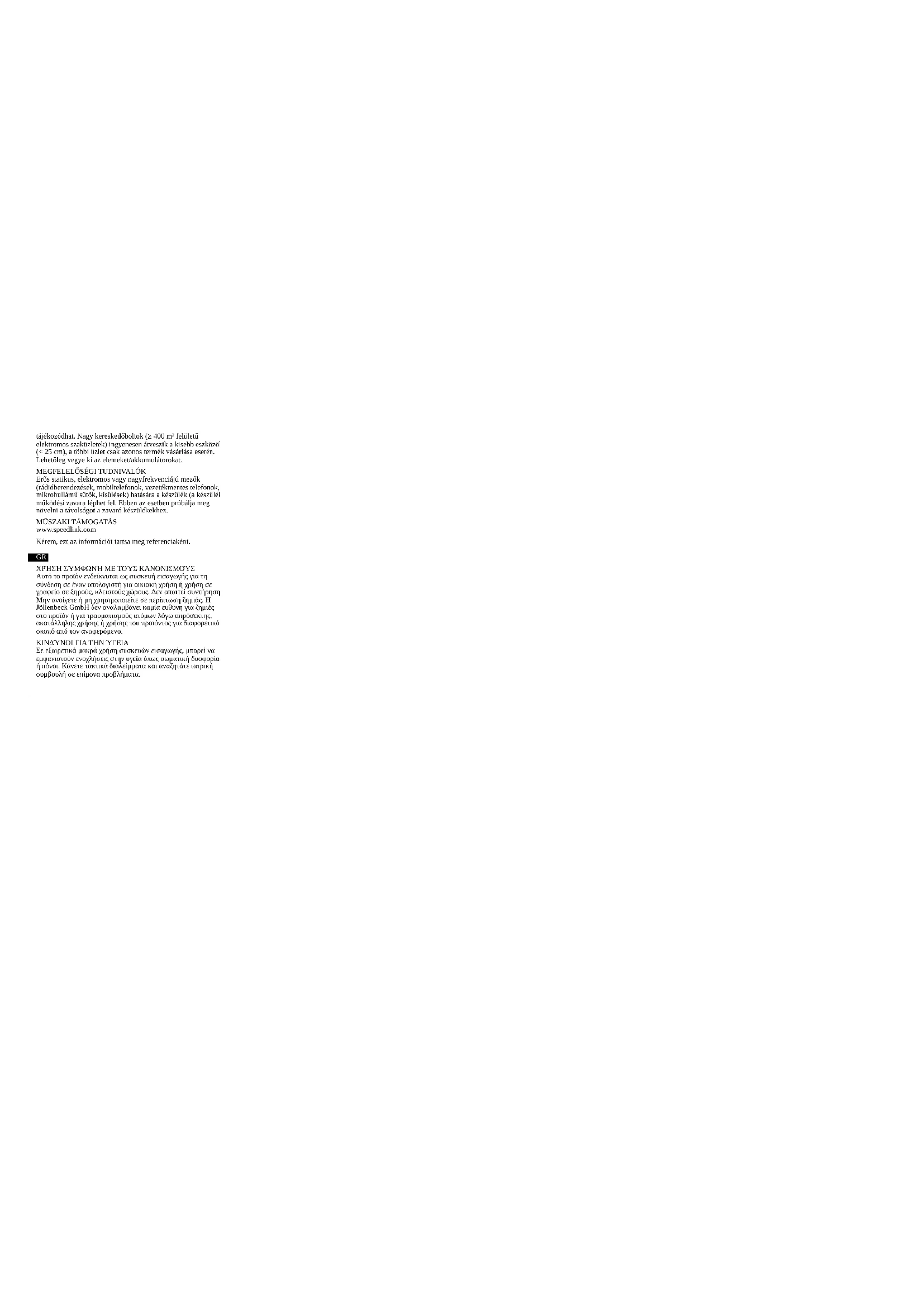 Το σύμβολο αυτό σημαίνει ότι το προϊόν δεν επιτρέπεται να απορρίπτεται με τα οικιακά απορρίμματα. Ακατάλληλη αποθήκευση/απόρριψη παλαιών συσκευών ή μπαταριών/συσσωρευτών μπορεί, λόγω ενδεχόμενα υφιστάμενων επιβλαβών ουσιών, να προκαλέσει ζημιά στο περιβάλλον και/ή στην ανθρώπινη υγεία και να οδηγήσει σε κυρώσεις σύμφωνα με τη νομοθεσία. Η παράδοση σε μια επίσημη υπηρεσία συλλογής είναι δωρεάν και είναι υποχρεωτική νομικά, εξασφαλίζει τη σωστή απόρριψη ή ανακύκλωση/ επαναχρησιμοποίηση και συνεισφέρει στην προστασία του περιβάλλοντος. Πληροφορίες μπορείτε να λάβετε από τις αρχές, τα κέντρα διάθεσης απορριμμάτων ή τα εξειδικευμένα καταστήματα. Τα μεγάλα καταστήματα λιανικής (καταστήματα ηλεκτρικών και ηλεκτρονικών ειδών με μια επιφάνεια ≥ 400m²) παραλαμβάνουν δωρεάν τις μικρές συσκευές (όλες οι διαστάσεις < 25εκ.) και άλλα μόνο στην περίπτωση αγοράς παρόμοιων προϊόντων. Αφαιρείτε εφόσον είναι δυνατό τις μπαταρίες/τους συσσωρευτές. ΎΠΟΔΕΙΞΉ ΣΎΜΜΟΡΦΩΣΉΣ Υπό την επίδραση δυνατών στατικών, ηλεκτρικών πεδίων ή πεδίων υψηλής συχνότητας (ασύρματες εγκαταστάσεις, κινητά τηλέφωνα, αποφορτίσεις συσκευών μικροκυμάτων) ίσως υπάρξουν επιδράσεις στη λειτουργία της συσκευής (των συσκευών). Σε αυτή την περίπτωση δοκιμάστε να αυξήσετε την απόσταση προς τις συσκευές που δημιουργούν παρεμβολή.ΤΕΧΝΙΚΉ ΎΠΟΣΤΉΡΙΞΉ www.speedlink.com Παρακαλούμε φυλάξτε αυτές τις πληροφορίες για μελλοντική αναφορά.