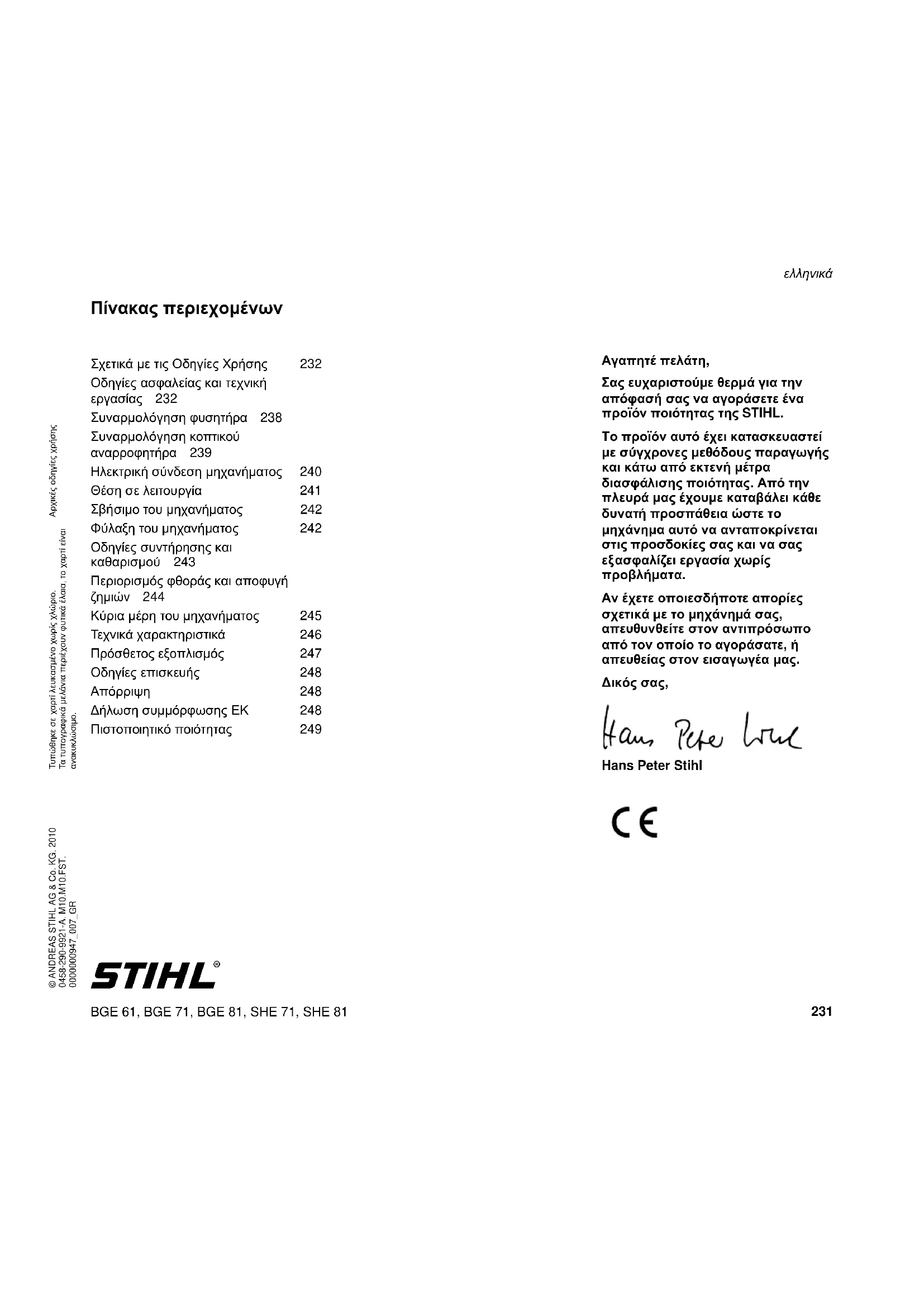 σιμο του μηχανήματος 242 Φύλαξη του μηχανήματος 242 Οδηγίες συντήρησης και καθαρισμού 243 Περιορισμός φθοράς και αποφυγή ζημιών 244 Κύρια μέρη του μηχανήματος 245 Τεχνικά χαρακτηριστικά 246 Πρόσθετος εξοπλισμός 247 Οδηγίες επισκευής 248 Απόρριψη 248 Δήλωση συμμόρφωσης ΕΚ 248 Πιστοποιητικό ποιότητας 249BGE 61, BGE 71, BGE 81, SHE 71, SHE 81