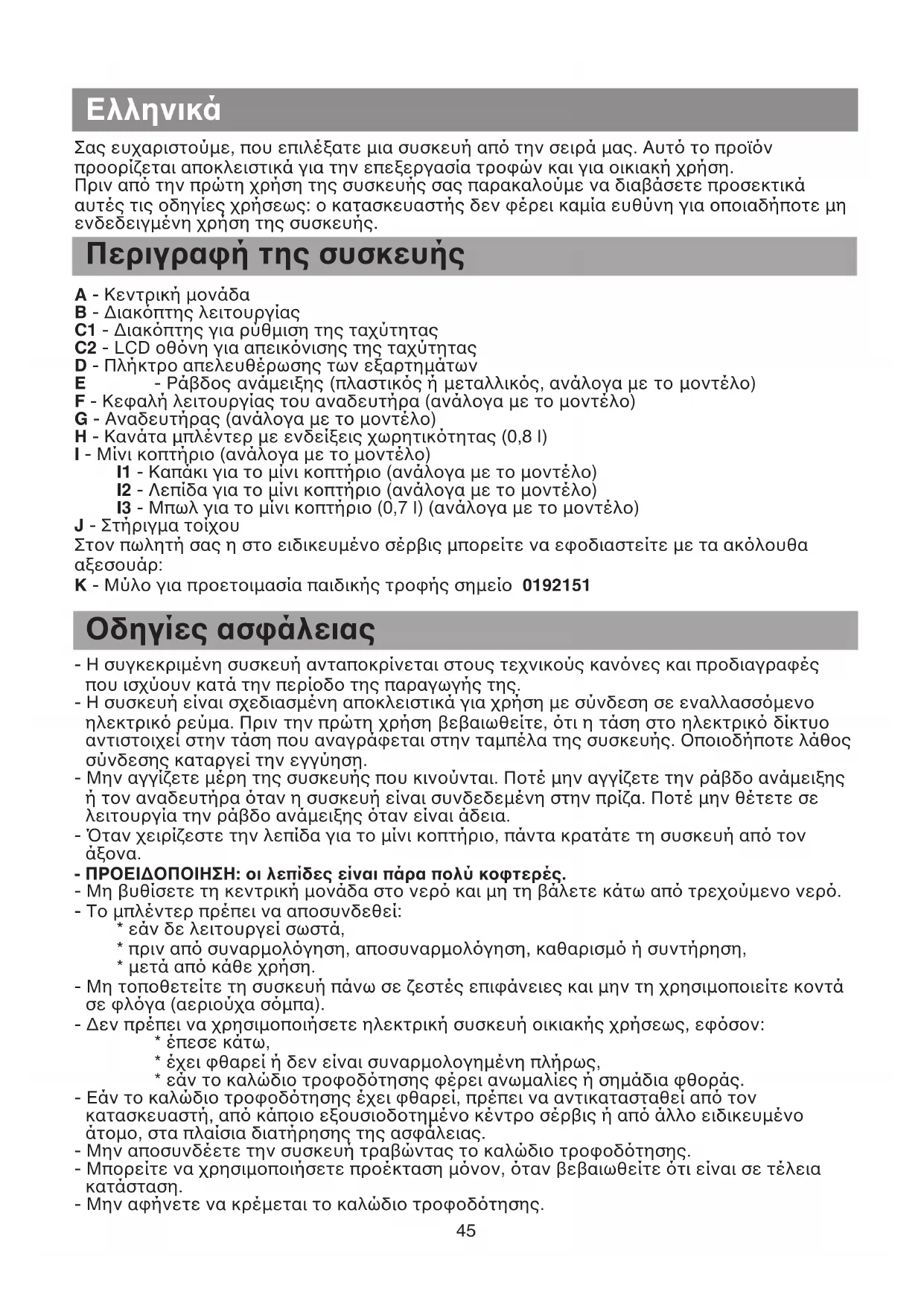 K - Μύλο για προετοιµασία παιδικής τροφής σηµείο 0192151 - Η συγκεκριµένη συσκευή ανταποκρίνεται στους τεχνικούς καννες και προδιαγραφές που ισχύουν κατά την περίοδο της παραγωγής της. - Η συσκευή είναι σχεδιασµένη αποκλειστικά για χρήση µε σύνδεση σε εναλλασσµενο ηλεκτρικ ρεύµα. Πριν την πρώτη χρήση βεβαιωθείτε, τι η τάση στο ηλεκτρικ δίκτυο αντιστοιχεί στην τάση που αναγράφεται στην ταµπέλα της συσκευής. Οποιοδήποτε λάθος σύνδεσης καταργεί την εγγύηση. - Μην αγγίζετε µέρη της συσκευής που κινούνται. Ποτέ µην αγγίζετε την ράβδο ανάµειξης ή τον αναδευτήρα ταν η συσκευή είναι συνδεδεµένη στην πρίζα. Ποτέ µην θέτετε σε λειτουργία την ράβδο ανάµειξης ταν είναι άδεια. - 9ταν χειρίζεστε την λεπίδα για το µίνι κοπτήριο, πάντα κρατάτε τη συσκευή απ τον