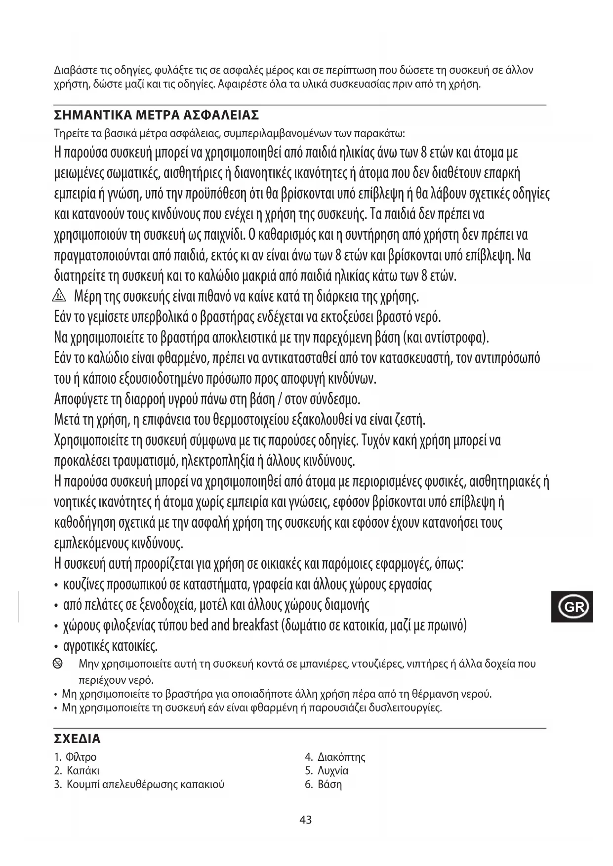 Τηρείτε τα βασικά μέτρα ασφάλειας, συμπεριλαμβανομένων των παρακάτω: Η παρούσα συσκευή μπορεί να χρησιμοποιηθεί από παιδιά ηλικίας άνω των 8 ετών και άτομα με μειωμένες σωματικές, αισθητήριες ή διανοητικές ικανότητες ή άτομα που δεν διαθέτουν επαρκή εμπειρία ή γνώση, υπό την προϋπόθεση ότι θα βρίσκονται υπό επίβλεψη ή θα λάβουν σχετικές οδηγίες και κατανοούν τους κινδύνους που ενέχει η χρήση της συσκευής. Τα παιδιά δεν πρέπει να χρησιμοποιούν τη συσκευή ως παιχνίδι. Ο καθαρισμός και η συντήρηση από χρήστη δεν πρέπει να πραγματοποιούνται από παιδιά, εκτός κι αν είναι άνω των 8 ετών και βρίσκονται υπό επίβλεψη. Να διατηρείτε τη συσκευή και το καλώδιο μακριά από παιδιά ηλικίας κάτω των 8 ετών. h Μέρη της συσκευής είναι πιθανό να καίνε κατά τη διάρκεια της χρήσης. Εάν το γεμίσετε υπερβολικά ο βραστήρας ενδέχεται να εκτοξεύσει βραστό νερό. Να χρησιμοποιείτε το βραστήρα αποκλειστικά με την παρεχόμενη βάση (και αντίστροφα). Εάν το καλώδιο είναι φθαρμένο, πρέπει να αντικατασταθεί από τον κατασκευαστή, τον αντιπρόσωπό του ή κάποιο εξουσιοδοτημένο πρόσωπο προς αποφυγή κινδύνων. Αποφύγετε τη διαρροή υγρού πάνω στη βάση / στον σύνδεσμο. Μετά τη χρήση, η επιφάνεια του θερμοστοιχείου εξακολουθεί να είναι ζεστή. Χρησιμοποιείτε τη συσκευή σύμφωνα με τις παρούσες οδηγίες. Τυχόν κακή χρήση μπορεί να προκαλέσει τραυματισμό, ηλεκτροπληξία ή άλλους κινδύνους. Η παρούσα συσκευή μπορεί να χρησιμοποιηθεί από άτομα με περιορισμένες φυσικές, αισθητηριακές ή νοητικές ικανότητες ή άτομα χωρίς εμπειρία και γνώσεις, εφόσον βρίσκονται υπό επίβλεψη ή καθοδήγηση σχετικά με την ασφαλή χρήση της συσκευής και εφόσον έχουν κατανοήσει τους εμπλεκόμενους κινδύνους. Η συσκευή αυτή προορίζεται για χρήση σε οικιακές και παρόμοιες εφαρμογές, όπως: