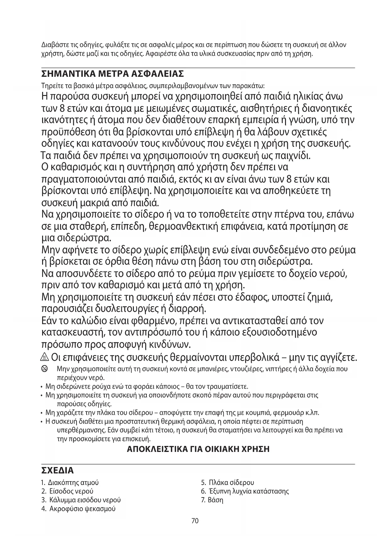 Τηρείτε τα βασικά μέτρα ασφάλειας, συμπεριλαμβανομένων των παρακάτω: Η παρούσα συσκευή μπορεί να χρησιμοποιηθεί από παιδιά ηλικίας άνω των 8 ετών και άτομα με μειωμένες σωματικές, αισθητήριες ή διανοητικές ικανότητες ή άτομα που δεν διαθέτουν επαρκή εμπειρία ή γνώση, υπό την προϋπόθεση ότι θα βρίσκονται υπό επίβλεψη ή θα λάβουν σχετικές οδηγίες και κατανοούν τους κινδύνους που ενέχει η χρήση της συσκευής. Τα παιδιά δεν πρέπει να χρησιμοποιούν τη συσκευή ως παιχνίδι. Ο καθαρισμός και η συντήρηση από χρήστη δεν πρέπει να πραγματοποιούνται από παιδιά, εκτός κι αν είναι άνω των 8 ετών και βρίσκονται υπό επίβλεψη. Να χρησιμοποιείτε και να αποθηκεύετε τη συσκευή μακριά από παιδιά. Να χρησιμοποιείτε το σίδερο ή να το τοποθετείτε στην πτέρνα του, επάνω σε μια σταθερή, επίπεδη, θερμοανθεκτική επιφάνεια, κατά προτίμηση σε μια σιδερώστρα. Μην αφήνετε το σίδερο χωρίς επίβλεψη ενώ είναι συνδεδεμένο στο ρεύμα ή βρίσκεται σε όρθια θέση πάνω στη βάση του στη σιδερώστρα. Να αποσυνδέετε το σίδερο από το ρεύμα πριν γεμίσετε το δοχείο νερού, πριν από τον καθαρισμό και μετά από τη χρήση. Μη χρησιμοποιείτε τη συσκευή εάν πέσει στο έδαφος, υποστεί ζημιά, παρουσιάζει δυσλειτουργίες ή διαρροή. Εάν το καλώδιο είναι φθαρμένο, πρέπει να αντικατασταθεί από τον κατασκευαστή, τον αντιπρόσωπό του ή κάποιο εξουσιοδοτημένο πρόσωπο προς αποφυγή κινδύνων. h Οι επιφάνειες της συσκευής θερμαίνονται υπερβολικά – μην τις αγγίζετε. b Μην χρησιμοποιείτε αυτή τη συσκευή κοντά σε μπανιέρες, ντουζιέρες, νιπτήρες ή άλλα δοχεία που περιέχουν νερό.