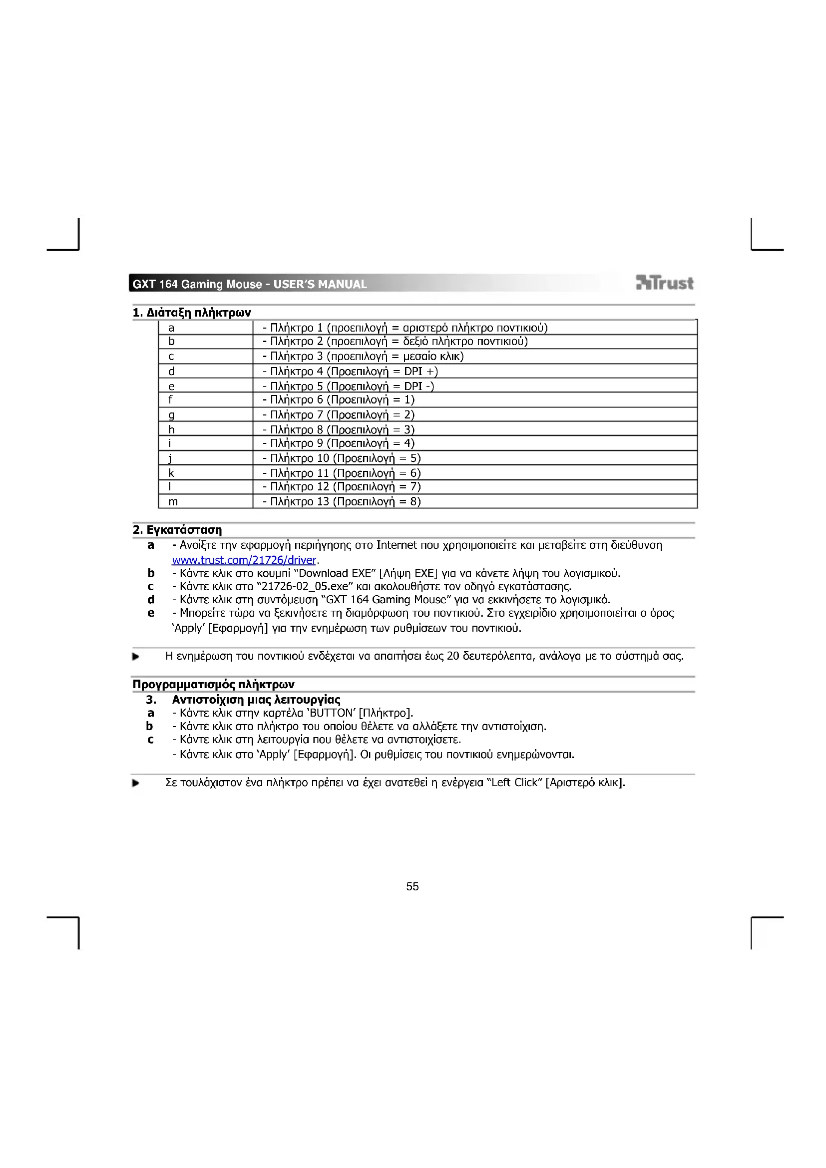 - Ανοίξτε την εφαρμογή περιήγησης στο Internet που χρησιμοποιείτε και μεταβείτε στη διεύθυνση www.trust.com/21726/driver. - Κάντε κλικ στο κουμπί “Download EXE” [Λήψη EXE] για να κάνετε λήψη του λογισμικού. - Κάντε κλικ στο “21726-02_05.exe” και ακολουθήστε τον οδηγό εγκατάστασης. - Κάντε κλικ στη συντόμευση “GXT 164 Gaming Mouse” για να εκκινήσετε το λογισμικό. - Μπορείτε τώρα να ξεκινήσετε τη διαμόρφωση του ποντικιού. Στο εγχειρίδιο χρησιμοποιείται ο όρος ‘Apply’ [Εφαρμογή] για την ενημέρωση των ρυθμίσεων του ποντικιού. Η ενημέρωση του ποντικιού ενδέχεται να απαιτήσει έως 20 δευτερόλεπτα, ανάλογα με το σύστημά σας. Προγραμματισμός πλήκτρων