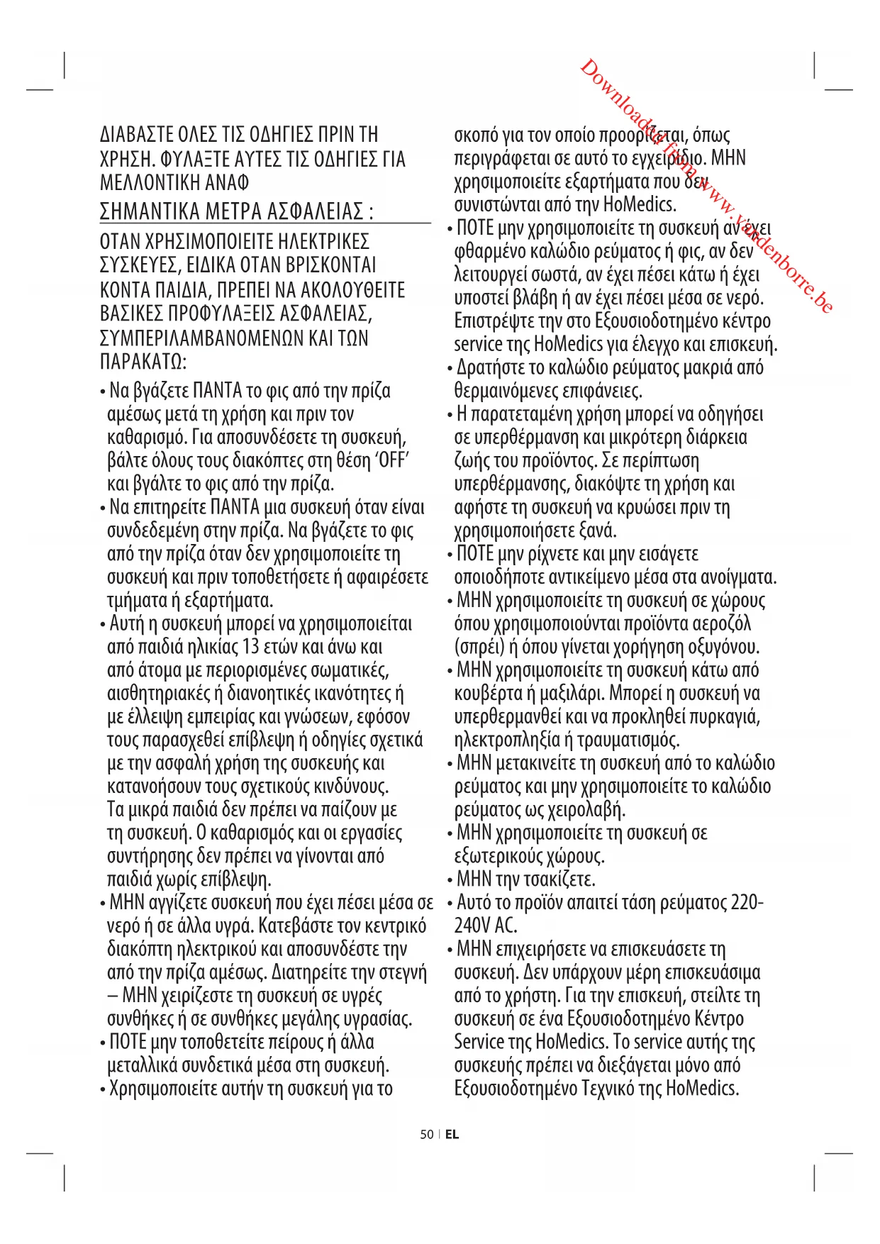- ΜΗΝ επιχειρήσετε να επισκευάσετε τη συσκευή. Δεν υπάρχουν μέρη επισκευάσιμα από το χρήστη. Για την επισκευή, στείλτε τη συσκευή σε ένα Εξουσιοδοτημένο Κέντρο Service της HoMedics. Το service αυτής της συσκευής πρέπει να διεξάγεται μόνο από Εξουσιοδοτημένο Τεχνικό της HoMedics. Downloaded from www.vandenborre.be51 I EL ερεθισμένες περιοχές του δέρματος ή επάνω σε εξανθήματα.