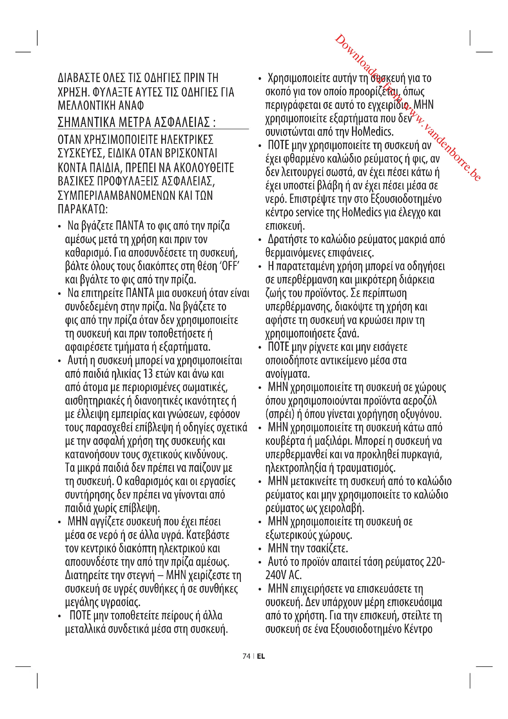 - ΜΗΝ επιχειρήσετε να επισκευάσετε τη συσκευή. Δεν υπάρχουν μέρη επισκευάσιμα από το χρήστη. Για την επισκευή, στείλτε τη συσκευή σε ένα Εξουσιοδοτημένο Κέντρο Downloaded from www.vandenborre.be75 I EL