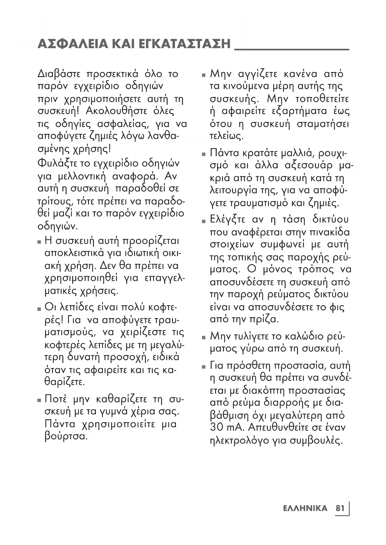 ΑΣΦΑΛΕΙΑ ΚΑΙ ΕΓΚΑΤΑΣΤΑΣΗ _________________ ∆ιαβάστε προσεκτικά όλο το παρόν εγχειρίδιο οδηγιών πριν χρησιµοποιήσετε αυτή τη συσκευή! Ακολουθήστε όλες τις οδηγίες ασφαλείας, για να αποφύγετε ζηµιές λόγω λανθα- σµένης χρήσης! Φυλάξτε το εγχειρίδιο οδηγιών για µελλοντική αναφορά. Αν αυτή η συσκευή παραδοθεί σε τρίτους, τότε πρέπει να παραδο- θεί µαζί και το παρόν εγχειρίδιο