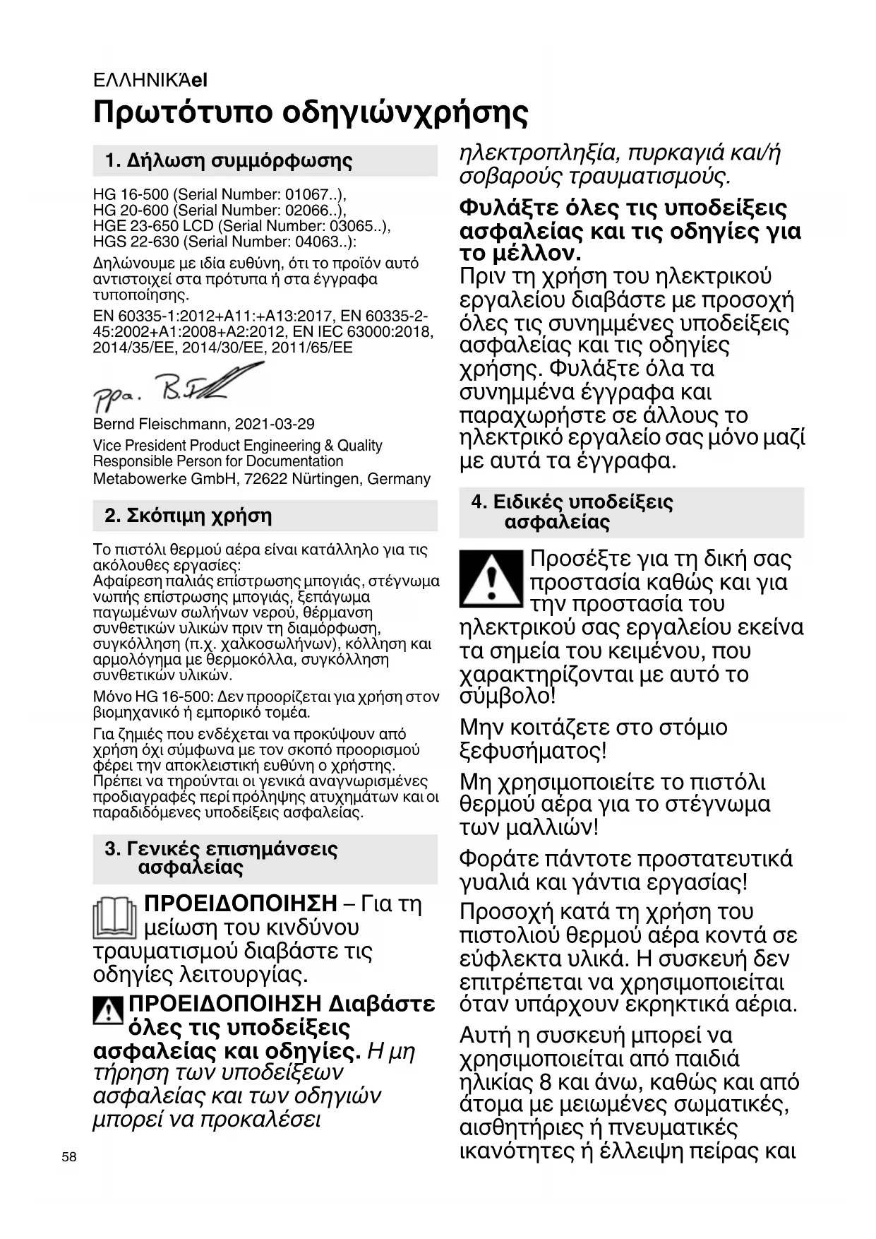 Πρωτότυπο οδηγιώνχρήσης HG 16-500 (Serial Number: 01067..), HG 20-600 (Serial Number: 02066..), HGE 23-650 LCD (Serial Number: 03065..), HGS 22-630 (Serial Number: 04063..): Δηλώνουμε με ιδία ευθύνη, ότι το προϊόν αυτό αντιστοιχεί στα πρότυπα ή στα έγγραφα τυποποίησης. EN 60335-1:2012+A11:+A13:2017, EN 60335-2- 45:2002+A1:2008+A2:2012, EN IEC 63000:2018, 2014/35/EΕ, 2014/30/EΕ, 2011/65/EΕ Bernd Fleischmann, 2021-03-29 Vice President Product Engineering & Quality Responsible Person for Documentation Metabowerke GmbH, 72622 Nürtingen, Germany Το πιστόλι θερμού αέρα είναι κατάλληλο για τις ακόλουθες εργασίες: Αφαίρεση παλιάς επίστρωσης μπογιάς, στέγνωμα νωπής επίστρωσης μπογιάς, ξεπάγωμα παγωμένων σωλήνων νερού, θέρμανση συνθετικών υλικών πριν τη διαμόρφωση, συγκόλληση (π.χ. χαλκοσωλήνων), κόλληση και αρμολόγημα με θερμοκόλλα, συγκόλληση συνθετικών υλικών. Μόνο HG 16-500: Δεν προορίζεται για χρήση στον βιομηχανικό ή εμπορικό τομέα