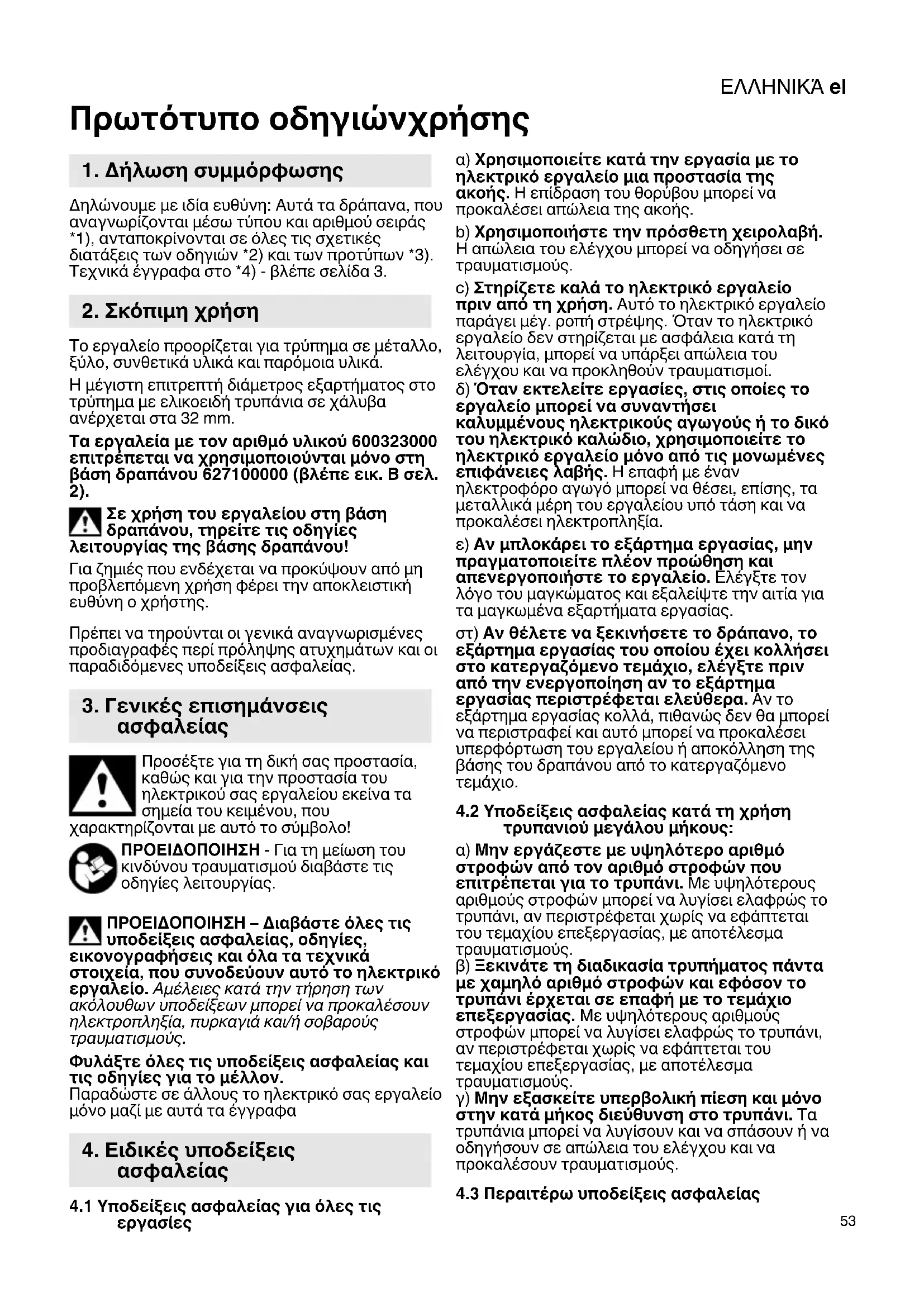 Πρωτότυπο οδηγιώνχρήσης Δηλώνουμε με ιδία ευθύνη: Αυτά τα δράπανα, που αναγνωρίζονται μέσω τύπου και αριθμού σειράς *1), ανταποκρίνονται σε όλες τις σχετικές διατάξεις των οδηγιών *2) και των προτύπων *3). Τεχνικά έγγραφα στο *4) - βλέπε σελίδα 3. Το εργαλείο προορίζεται για τρύπημα σε μέταλλο, ξύλο, συνθετικά υλικά και παρόμοια υλικά. Η μέγιστη επιτρεπτή διάμετρος εξαρτήματος στο τρύπημα με ελικοειδή τρυπάνια σε χάλυβα ανέρχεται στα 32 mm. Τα εργαλεία με τον αριθμό υλικού 600323000 επιτρέπεται να χρησιμοποιούνται μόνο στη βάση δραπάνου 627100000 (βλέπε εικ. B σελ. 2). Σε χρήση του εργαλείου στη βάση δραπάνου, τηρείτε τις οδηγίες λειτουργίας της βάσης δραπάνου! Για ζημιές που ενδέχεται να προκύψουν από μη προβλεπόμενη χρήση φέρει την αποκλειστική ευθύνη ο χρήστης. Πρέπει να τηρούνται οι γενικά αναγνωρισμένες προδιαγραφές περί πρόληψης ατυχημάτων και οι παραδιδόμενες υποδείξεις ασφαλείας. Προσέξτε για τη δική σας προστασία, καθώς και για την προστασία του ηλεκτρικού σας εργαλείου εκείνα τα σημεία του κειμένου, που χαρακτηρίζονται με αυτό το σύμβολο! ΠΡΟΕΙΔΟΠΟΙΗΣΗ - Για τη μείωση του κινδύνου τραυματισμού διαβάστε τις οδηγίες λειτουργίας. ΠΡΟΕΙΔΟΠΟΙΗΣΗ – Διαβάστε όλες τις υποδείξεις ασφαλείας, οδηγίες, εικονογραφήσεις και όλα τα τεχνικά στοιχεία, που συνοδεύουν αυτό το ηλεκτρικό εργαλείο. Αμέλειες κατά την τήρηση των ακόλουθων υποδείξεων μπορεί να προκαλέσουν ηλεκτροπληξία, πυρκαγιά και/ή σοβαρούς τραυματισμούς. Φυλάξτε όλες τις υποδείξεις ασφαλείας και τις οδηγίες για το μέλλον. Παραδώστε σε άλλους το ηλεκτρικό σας εργαλείο μόνο μαζί με αυτά τα έγγραφα