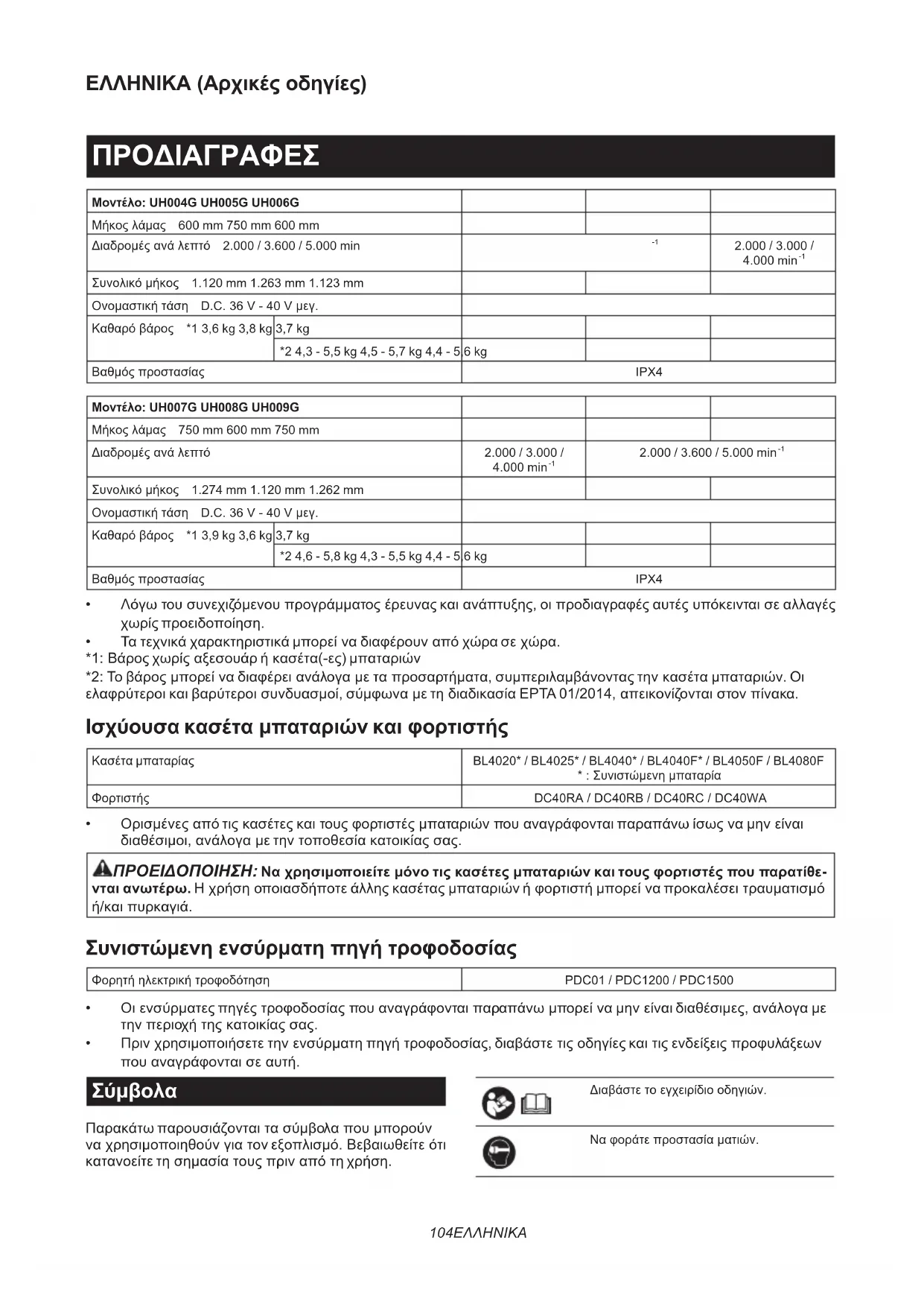 Συνολικόμήκος 1.120 mm 1.263 mm 1.123 mm Ονομαστικήτάση D.C.36V-40Vμεγ. Καθαρόβάρος *1 3,6 kg 3,8 kg 3,7 kg *2 4,3 - 5,5 kg 4,5 - 5,7 kg 4,4 - 5,6 kg Βαθμόςπροστασίας IPX4 Μοντέλο: UH007G UH008G UH009G Μήκοςλάμας 750 mm 600 mm 750 mm Διαδρομέςανάλεπτό 2.000 / 3.000 /