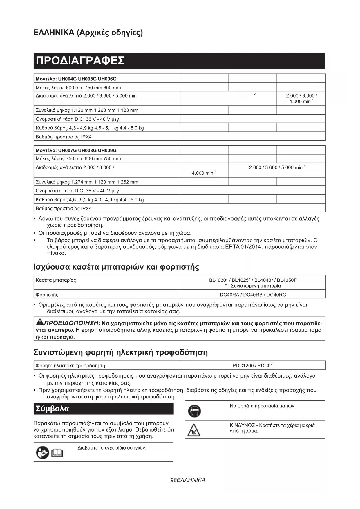 Συνολικό μήκος 1.120 mm 1.263 mm 1.123 mm Ονομαστική τάση D.C. 36 V - 40 V μεγ. Καθαρό βάρος 4,3 - 4,9 kg 4,5 - 5,1 kg 4,4 - 5,0 kg Βαθμός προστασίας IPX4 Μοντέλο: UH007G UH008G UH009G Μήκος λάμας 750 mm 600 mm 750 mm Διαδρομές ανά λεπτό 2.000 / 3.000 /