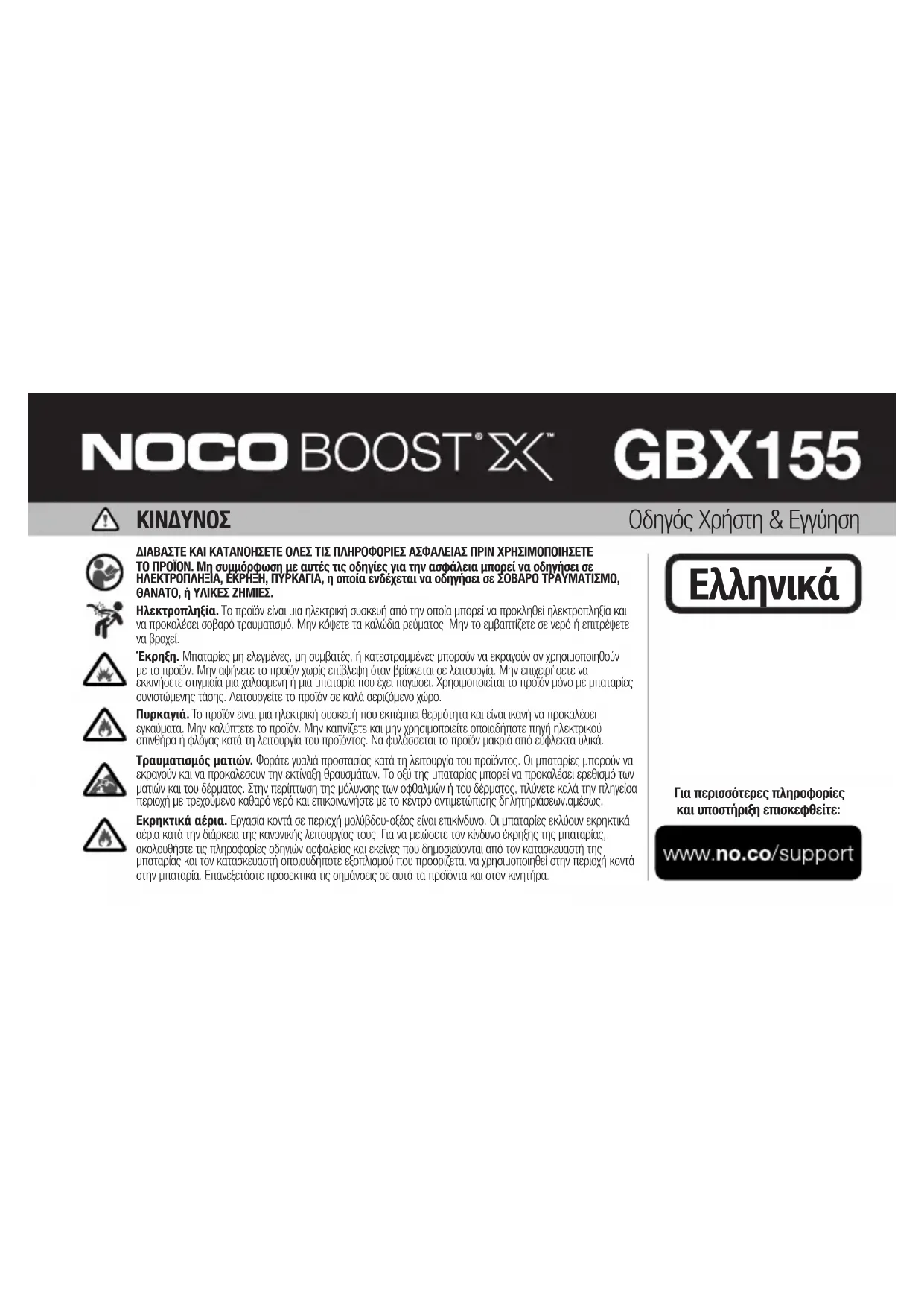 Έκρηξη. Μπαταρίες μη ελεγμένες, μη συμβατές, ή κατεστραμμένες μπορούν να εκραγούν αν χρησιμοποιηθούν με το προϊόν. Μην αφήνετε το προϊόν χωρίς επίβλεψη όταν βρίσκεται σε λειτουργία. Μην επιχειρήσετε να εκκινήσετε στιγμιαία μια χαλασμένη ή μια μπαταρία που έχει παγώσει. Χρησιμοποιείται το προϊόν μόνο με μπαταρίες συνιστώμενης τάσης. Λειτουργείτε το προϊόν σε καλά αεριζόμενο χώρο. Πυρκαγιά. Το προϊόν είναι μια ηλεκτρική συσκευή που εκπέμπει θερμότητα και είναι ικανή να προκαλέσει εγκαύματα. Μην καλύπτετε το προϊόν. Μην καπνίζετε και μην χρησιμοποιείτε οποιαδήποτε πηγή ηλεκτρικού σπινθήρα ή φλόγας κατά τη λειτουργία του προϊόντος. Να φυλάσσεται το προϊόν μακριά από εύφλεκτα υλικά. Τραυματισμός ματιών. Φοράτε γυαλιά προστασίας κατά τη λειτουργία του προϊόντος. Οι μπαταρίες μπορούν να εκραγούν και να προκαλέσουν την εκτίναξη θραυσμάτων. Το οξύ της μπαταρίας μπορεί να προκαλέσει ερεθισμό των ματιών και του δέρματος. Στην περίπτωση της μόλυνσης των οφθαλμών ή του δέρματος, πλύνετε καλά την πληγείσα περιοχή με τρεχούμενο καθαρό νερό και επικοινωνήστε με το κέντρο αντιμετώπισης δηλητηριάσεων.αμέσως. Εκρηκτικά αέρια. Εργασία κοντά σε περιοχή μολύβδου-οξέος είναι επικίνδυνο. Οι μπαταρίες εκλύουν εκρηκτικά αέρια κατά την διάρκεια της κανονικής λειτουργίας τους. Για να μειώσετε τον κίνδυνο έκρηξης της μπαταρίας, ακολουθήστε τις πληροφορίες οδηγιών ασφαλείας και εκείνες που δημοσιεύονται από τον κατασκευαστή της μπαταρίας και τον κατασκευαστή οποιουδήποτε εξοπλισμού που προορίζεται να χρησιμοποιηθεί στην περιοχή κοντά στην μπαταρία. Επανεξετάστε προσεκτικά τις σημάνσεις σε αυτά τα προϊόντα και στον κινητήρα. Για περισσότερες πληροφορίες και υποστήριξη επισκεφθείτε: ΕλληνικάΠροσωπικές προφυλάξεις. Χρησιμοποιείτε το προϊόν μόνο για το σκοπό που προορίζεται. Κάποιος θα πρέπει να είναι εντός της εμβέλειας της φωνής σας ή αρκετά κοντά για να έρθει να σας βοηθήσει σε περίπτωση ανάγκης. Να έχετε στη διάθεσή σας μια ποσότητα καθαρού νερού και σαπουνιού πλησίον σας σε περίπτωση μόλυνσης από οξύ μπαταρίας. Να φοράτε πλήρη προστατευτικά γυαλιά ματιών και προστατευτικό ρουχισμό όταν εργάζεστε κοντά σε μια μπαταρία. Πάντα να πλένετε τα χέρια σας μετά το χειρισμό μπαταριών και συναφών υλικών. Μην χειρίζεστε ή φοράτε τυχόν μεταλλικά αντικείμενα όταν εργάζεστε με μπαταρίες συμπεριλαμβανομένων, εργαλείων, ρολογιών ή κοσμημάτων. Αν μεταλλικό αντικείμενο πέσει πάνω στη μπαταρία, μπορεί να προκαλέσει ή να δημιουργήσει ένα βραχυκύκλωμα που να έχει ως αποτέλεσμα την πρόκληση ηλεκτροπληξίας, πυρκαγιάς, έκρηξης, η οποία μπορεί να έχει ως αποτέλεσμα τραυματισμό, θάνατο ή υλικές ζημιές. Ανήλικα: Εάν το προϊόν προορίζεται από τον «Αγοραστή» για να χρησιμοποιείται από ένα ανήλικο, ο ενήλικας αγοραστής συμφωνεί να παράσχει λεπτομερείς οδηγίες και προειδοποιήσεις σε κάθε ανήλικο πριν από τη χρήση. Η μη τήρηση των ανωτέρω είναι αποκλειστική ευθύνη του «Αγοραστή», ο οποίος συμφωνεί να απαλλάξει από οποιεσδήποτε απαιτήσεις τη NOCO για τυχόν ακούσια ή κακή χρήση από έναν ανήλικο. Κίνδυνος πνιγμού. Τα αξεσουάρ μπορούν να παρουσιάσουν κίνδυνο πνιγμού για τα παιδιά. Μην αφήνετε τα παιδιά σας χωρίς επίβλεψη με τη συσκευή ή οποιοδήποτε αξεσουάρ. Αυτό το προϊόν δεν είναι παιχνίδι. Χειρισμός. Ο χειρισμός αυτού του προϊόντος πρέπει να γίνεται με προσοχή. Το π
