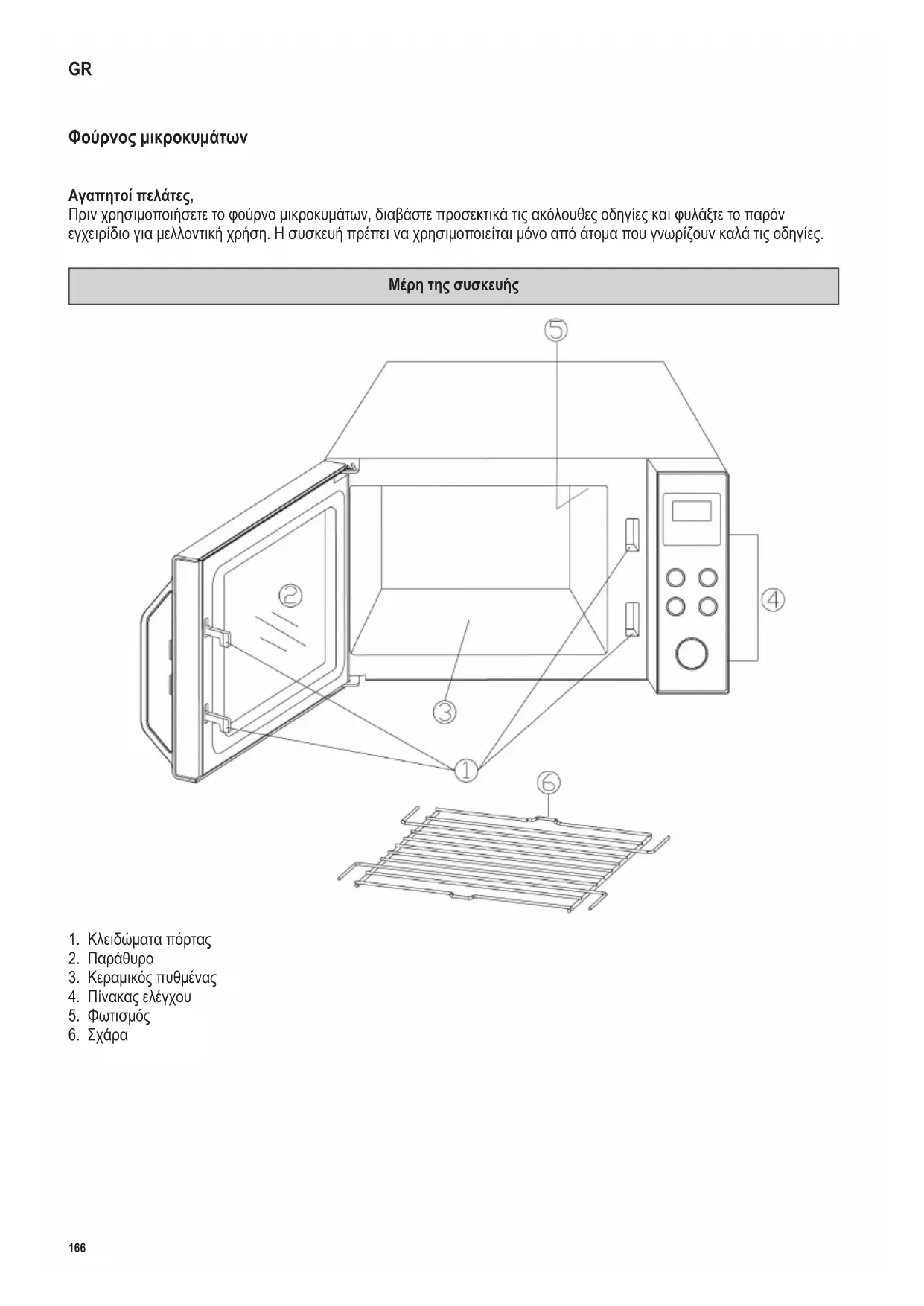 Λειτουργίασχάρας Λειτουργίαμικροκυμάτων Αυτόματαπρογράμματα Απόψυξησύμφωναμετοχρόνο169 142 x 208 mm Κανόνεςασφάλειας Σημαντικοίκανόνεςασφάλειας Διαβάστεπροσεκτικάτιςακόλουθεςοδηγίεςκαιφυλάξτετοπαρόνεγχειρίδιο οδηγιώνγιαμελλοντικήχρήση. Σύνδεσημετηνκεντρικήπαροχήρεύματος ∙ Η συσκευή αυτή πρέπει να συνδέεται μόνο με γειωμένη πρίζα, εγκατεστημένη σύμφωνα με τις ισχύουσες διατάξεις. Βεβαιωθείτε ότι η τάση του ηλεκτρικού ρεύματος που χρησιμοποιείτε συμβαδίζει με αυτή που αναγράφεται στη συσκευή. Το προϊόν αυτό συμμορφώνεται με όλες τις ισχύουσες οδηγίες της ΕΕ σχετικά με την αναγραφή στοιχείων. Τοποθέτησησυσκευής ∙ Να τοποθετείτε το φούρνο μικροκυμάτων πάντα σε σταθερή και επίπεδη επιφάνεια ανθεκτική στη θερμότητα και αφού πρώτα βεβαιωθείτε ότι προστατεύεται από κάθε πηγή θερμότητας ή υπερβολική υγρασία. ∙ Μη χρησιμοποιείτε τη συσκευή σε εξωτερικούς χώρους. ∙ Μη βγάζετε τα πόδια από τη βάση της συσκευής. ∙ Πρέπει να υπάρχει πάντα επαρκής εξαερισμός. Μην ακουμπάτε αντικείμενα επάνω στη συσκευή και φροντίζετε ώστε να τηρούνται οι ακόλουθες ελάχιστες αποστάσεις: Πλαϊνά: 7,5 εκατοστά Πίσω μέρος: 7,5 εκατοστά Επάνω μέρος: 30,0 εκατοστά Η μονάδα δεν πρέπει να τοποθετείται μέσα σε ντουλάπι. Όταν τοποθετείτε τη μονάδα, βεβαιωθείτε επίσης ότι δεν βρίσκεται ακριβώς κάτω από κάποιο ντουλάπι ή άλλο παρόμοιο αντικείμενο. Σημαντικέςπληροφορίες ∙ Προσοχή:Ορισμένοιτύποιτροφίμωνέχουντηντάσηνααναφλέγονται. Σεκαμίαπερίπτωση,μηναφήνετετησυσκευήχωρίςεπιτήρησηόταν χρησιμοποιείτεταμικροκύματα,τησχάραήσυνδυασμούςλειτουργιών. ∙ Αυτός ο φούρνος μικροκυμάτων προορίζεται μόνο για απόψυξη, ζέσταμα και μαγείρεμα φαγητού. Προσοχή! Οποιαδήποτε απόπειρα να ξηράνετε τρόφιμα ή να στεγνώσετε ρούχα, να θερμάνετε θερμαντικά μαξιλάρια, παντόφλες, σπόγγους, υγρά ρούχα καθαρισμού, κτλ. μπορεί να προκαλέσει τραυματισμούς, καύση ή πυρκαγιά.170 142 x 208 mm ∙ Δεν αναλαμβάνουμε καμία ευθύνη για το ενδεχόμενο πρόκλησης ζημιάς από λανθασμένη χρήση της συσκευής ή σε περίπτωση μη τήρησης αυτών των