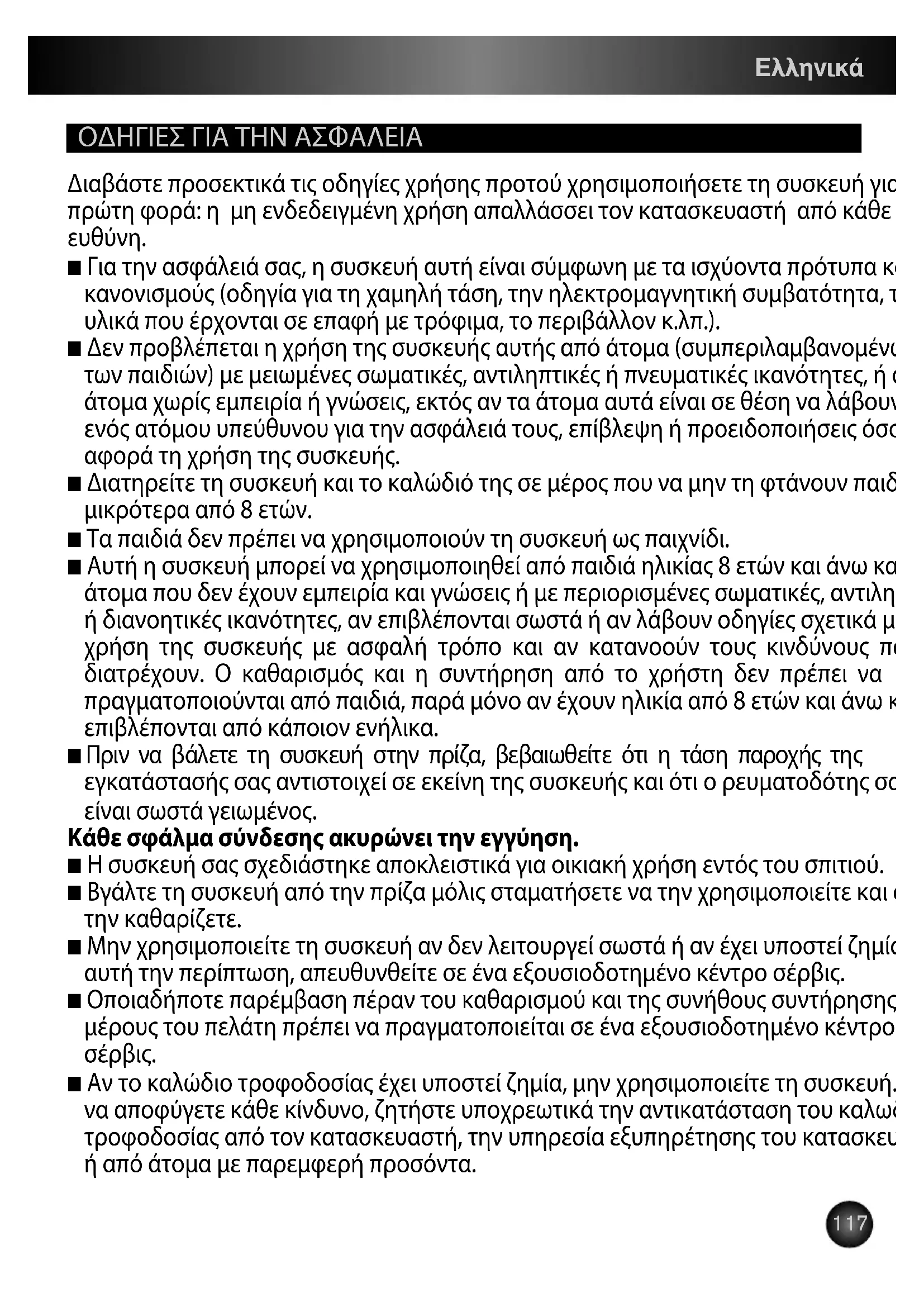 ■ Για την ασφάλειά σας, η συσκευή αυτή είναι σύμφωνη με τα ισχύοντα πρότυπα και τους κανονισμούς (οδηγία για τη χαμηλή τάση, την ηλεκτρομαγνητική συμβατότητα, τα υλικά που έρχονται σε επαφή με τρόφιμα, το περιβάλλον κ.λπ.). ■ Δεν προβλέπεται η χρήση της συσκευής αυτής από άτομα (συμπεριλαμβανομένων των παιδιών) με μειωμένες σωματικές, αντιληπτικές ή πνευματικές ικανότητες, ή από άτομα χωρίς εμπειρία ή γνώσεις, εκτός αν τα άτομα αυτά είναι σε θέση να λάβουν, μέσω ενός ατόμου υπεύθυνου για την ασφάλειά τους, επίβλεψη ή προειδοποιήσεις όσον αφορά τη χρήση της συσκευής. ■ Διατηρείτε τη συσκευή και το καλώδιό της σε μέρος που να μην τη φτάνουν παιδιά μικρότερα από 8 ετών. ■ Τα παιδιά δεν πρέπει να χρησιμοποιούν τη συσκευή ως παιχνίδι. ■ Αυτή η συσκευή μπορεί να χρησιμοποιηθεί από παιδιά ηλικίας 8 ετών και άνω και από άτομα που δεν έχουν εμπειρία και γνώσεις ή με περιορισμένες σωματικές, αντιληπτικές ή διανοητικές ικανότητες, αν επιβλέπονται σωστά ή αν λάβουν οδηγίες σχετικά με τη χρήση της συσκευής με ασφαλή τρόπο και αν κατανοούν τους κινδύνους που διατρέχουν. Ο καθαρισμός και η συντήρηση από το χρήστη δεν πρέπει να πραγματοποιούνται από παιδιά, παρά μόνο αν έχουν ηλικία από 8 ετών και άνω και επιβλέπονται από κάποιον ενήλικα. ■ Πριν να βάλετε τη συσκευή στην πρίζα, βεβαιωθείτε ότι η τάση παροχής της εγκατάστασής σας αντιστοιχεί σε εκείνη της συσκευής και ότι ο ρευματοδότης σας είναι σωστά γειωμένος. Κάθε σφάλμα σύνδεσης ακυρώνει την εγγύηση. ■ Η συσκευή σας σχεδιάστηκε αποκλειστικά για οικιακή χρήση εντός του σπιτιού. ■ Βγάλτε τη συσκευή από την πρίζα μόλις σταματήσετε να την χρησιμοποιείτε και όταν την καθαρίζετε. ■ Μην χρησιμοποιείτε τη συσκευή αν δεν λειτουργεί σωστά ή αν έχει υποστεί ζημία. Σε αυτή την περίπτωση, απευθυνθείτε σε ένα εξουσιοδοτημένο κέντρο σέρβις. ■ Οποιαδήποτε παρέμβαση πέραν του καθαρισμού και της συνήθους συντήρησης εκ μέρους του πελάτη πρέπει να πραγματοποιείται σε ένα εξουσιοδοτημένο κέντρο