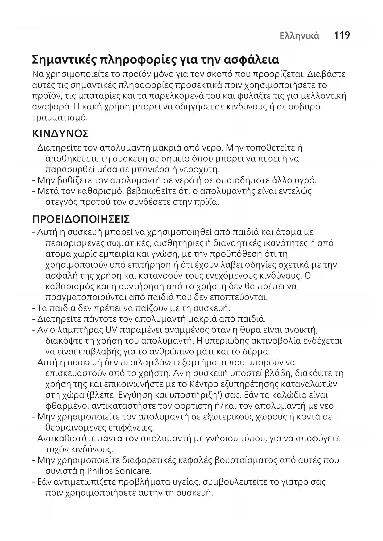 - Διατηρείτε τον απολυμαντή μακριά από νερό. Μην τοποθετείτε ή αποθηκεύετε τη συσκευή σε σημείο όπου μπορεί να πέσει ή να παρασυρθεί μέσα σε μπανιέρα ή νεροχύτη. - Μην βυθίζετε τον απολυμαντή σε νερό ή σε οποιοδήποτε άλλο υγρό. - Μετά τον καθαρισμό, βεβαιωθείτε ότι ο απολυμαντής είναι εντελώς στεγνός προτού τον συνδέσετε στην πρίζα. ΠΡΟΕΙΔΟΠΟΙΗΣΕΙΣ - Αυτή η συσκευή μπορεί να χρησιμοποιηθεί από παιδιά και άτομα με περιορισμένες σωματικές, αισθητήριες ή διανοητικές ικανότητες ή από άτομα χωρίς εμπειρία και γνώση, με την προϋπόθεση ότι τη χρησιμοποιούν υπό επιτήρηση ή ότι έχουν λάβει οδηγίες σχετικά με την ασφαλή της χρήση και κατανοούν τους ενεχόμενους κινδύνους. Ο καθαρισμός και η συντήρηση από το χρήστη δεν θα πρέπει να πραγματοποιούνται από παιδιά που δεν εποπτεύονται. - Τα παιδιά δεν πρέπει να παίζουν με τη συσκευή. - Διατηρείτε πάντοτε τον απολυμαντή μακριά από παιδιά. - Αν ο λαμπτήρας UV παραμένει αναμμένος όταν η θύρα είναι ανοικτή, διακόψτε τη χρήση του απολυμαντή. Η υπεριώδης ακτινοβολία ενδέχεται να είναι επιβλαβής για το ανθρώπινο μάτι και το δέρμα. - Αυτή η συσκευή δεν περιλαμβάνει εξαρτήματα που μπορούν να επισκευαστούν από το χρήστη. Αν η συσκευή υποστεί βλάβη, διακόψτε τη χρήση της και επικοινωνήστε με το Κέντρο εξυπηρέτησης καταναλωτών στη χώρα (βλέπε 'Εγγύηση και υποστήριξη') σας. Εάν το καλώδιο είναι φθαρμένο, αντικαταστήστε τον φορτιστή ή/και τον απολυμαντή με νέο. - Μην χρησιμοποιείτε τον απολυμαντή σε εξωτερικούς χώρους ή κοντά σε θερμαινόμενες επιφάνειες. - Αντικαθιστάτε πάντα τον απολυμαντή με γνήσιου τύπου, για να αποφύγετε τυχόν κινδύνους. - Μην χρησιμοποιείτε διαφορετικές κεφαλές βουρτσίσματος από αυτές που συνιστά η Philips Sonicare. - Εάν αντιμετωπίζετε προβλήματα υγείας, συμβουλευτείτε το γιατρό σας πριν χρησιμοποιήσετε αυτήν τη συσκευή.120