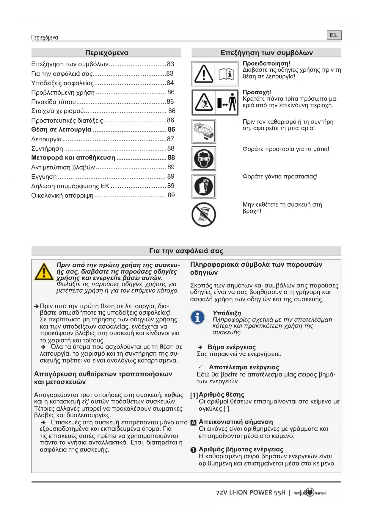 Κρατάτε πάντα τρίτα πρόσωπα μα- κριά από την επικίνδυνη περιοχή. Πριν τον καθαρισμό ή τη συντήρη- ση, αφαιρείτε τη μπαταρία! Φοράτε προστασία για τα μάτια! Φοράτε γάντια προστασίας! Μην εκθέτετε τη συσκευή στη βροχή!84 | | 72V LI-ION POWER 55H Υποδείξεις ασφαλείας