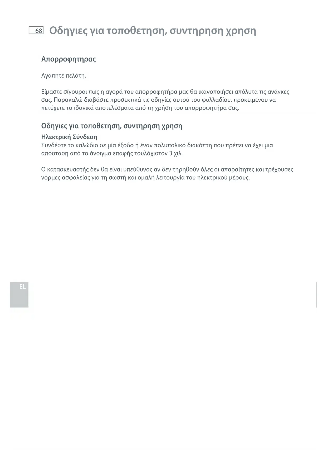 Οδηγιες για τοποθετηση, συντηρηση χρηση Απορροφητηρας Αγαπητέ πελάτη, Είμαστε σίγουροι πως η αγορά του απορροφητήρα μας θα ικανοποιήσει απόλυτα τις ανάγκες σας. Παρακαλώ διαβάστε προσεκτικά τις οδηγίες αυτού του φυλλαδίου, προκειμένου να πετύχετε τα ιδανικά αποτελέσματα από τη χρήση του απορροφητήρα σας. Οδηγιες για τοποθετηση, συντηρηση χρηση Ηλεκτρική Σύνδεση Συνδέστε το καλώδιο σε μία έξοδο ή έναν πολυπολικό διακόπτη που πρέπει να έχει μια απόσταση από το άνοιγμα επαφής τουλάχιστον 3 χιλ. Ο κατασκευαστής δεν θα είναι υπεύθυνος αν δεν τηρηθούν όλες οι απαραίτητες και τρέχουσες νόρμες ασφαλείας για τη σωστή και ομαλή λειτουργία του ηλεκτρικού μέρους.69