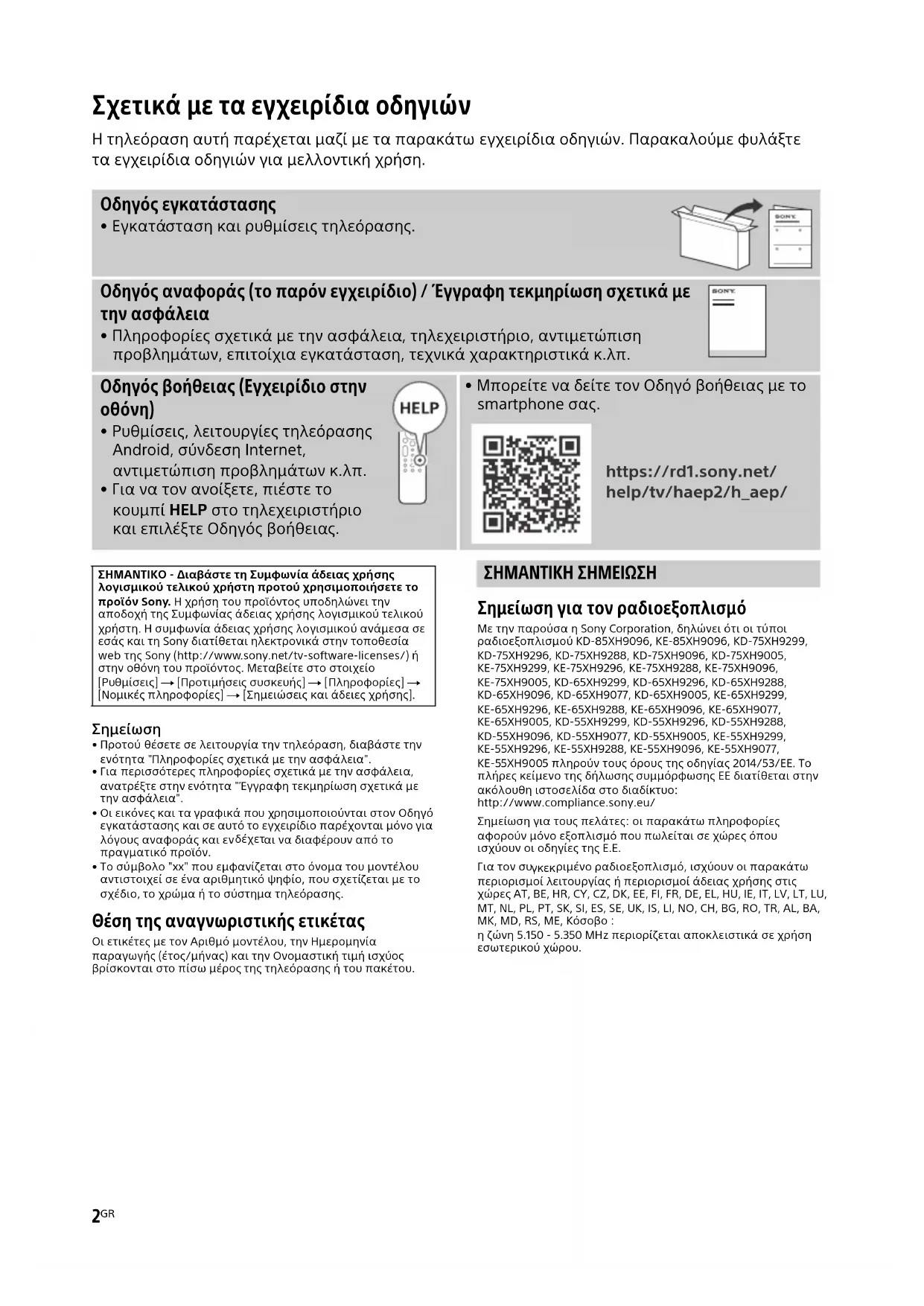 - Μπορείτε να δείτε τον Οδηγό βοήθειας με το smartphone σας. https://rd1.sony.net/ help/tv/haep2/h_aep/ ΣΗΜΑΝΤΙΚΟ - Διαβάστε τη Συμφωνία άδειας χρήσης λογισμικού τελικού χρήστη προτού χρησιμοποιήσετε το προϊόν Sony. Η χρήση του προϊόντος υποδηλώνει την αποδοχή της Συμφωνίας άδειας χρήσης λογισμικού τελικού χρήστη. Η συμφωνία άδειας χρήσης λογισμικού ανάμεσα σε εσάς και τη Sony διατίθεται ηλεκτρονικά στην τοποθεσία web της Sony (http://www.sony.net/tv-software-licenses/) ή στην οθόνη του προϊόντος. Μεταβείτε στο στοιχείο θμίσεις] t [Προτιμήσει ς συσκευής] t [Πληροφορίες] t [Νομικές πληροφορίες] t [Σημειώσεις και άδειες χρήσης].D:\SONY TV\2020\SY20_NX_EU_RG_121\Final\5014855121\5014855121\5014855121_18GR\5014855121_18 GR.fm master page: Right KD-85XH90xx / 75XH92xx / 75XH90xx / 65XH92xx / 65XH90xx / 55XH92xx / 55XH90xx / KE-85XH90xx / 75XH92xx / 75XH90xx / 65XH92xx / 65XH90xx / 55XH92xx / 55XH90xx 5-014-855-12(1)