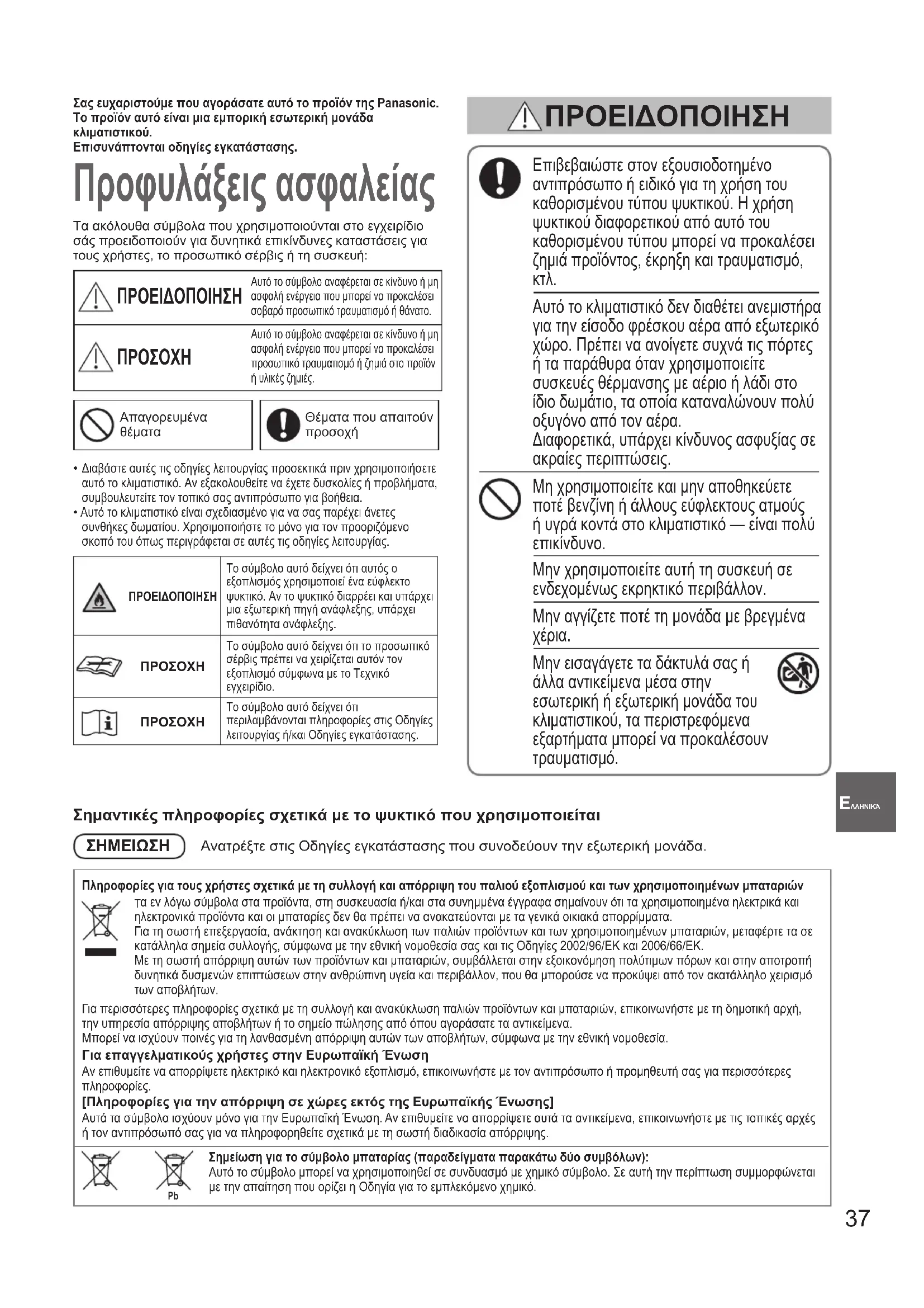 Αυτή η συσκευή προορίζεται για χρήση από ειδήμονες ή εκπαιδευμένους χρήστες σε μαγαζιά, στη βιομηχανία φώτων και σε αγροκτήματα, ή για εμπορική χρήση από μη ειδήμονες. Αυτή η συσκευή μπορεί να χρησιμοποιηθεί από παιδιά από 8 ετών και πάνω και άτομα με μειωμένες σωματικές, αισθητήριες ή νοητικές ικανότητες ή έλλειψη εμπειρίας και γνώσεων αν τους έχει παρασχεθεί επίβλεψη ή καθοδήγηση σχετικά με την ασφαλή χρήση της συσκευής, και κατανοούν τους κινδύνους που εμπλέκονται. Τα παιδιά δεν επιτρέπεται να παίζουν με τη συσκευή. Οι εργασίες καθαρισμού και συντήρησης δεν πρέπει να γίνονται από παιδιά, χωρίς την επίβλεψή τους. Διατηρείτε το συναγερμό πυρκαγιάς και την έξοδο αέρα τουλάχιστον 1,5 m μακριά από τη μονάδα. Μην ψύχετε και μη θερμαίνετε υπερβολικά το δωμάτιο όταν βρίσκονται μωρά ή ασθενείς σε αυτό. Μην ενεργοποιείτε και μην απενεργοποιείτε το κλιματιστικό από το διακόπτη κύριας ηλεκτρικής παροχής. Να χρησιμοποιείτε το κουμπί λειτουργίας ON/OFF. Μη βάζετε τίποτα μέσα στην έξοδο αέρα της εξωτερικής μονάδας. Αυτό είναι επικίνδυνο επειδή ο ανεμιστήρας περιστρέφεται με υψηλή ταχύτητα. Μην αγγίζετε την είσοδο αέρα ή τα αιχμηρά πτερύγια αλουμινίου της εξωτερικής μονάδας. Μπορεί να τραυματιστείτε. Μην τοποθετείτε κανένα αντικείμενο στη ΘΗΚΗ ΑΝΕΜΙΣΤΗΡΑ. Μπορεί να τραυματιστείτε και η μονάδα μπορεί να υποστεί ζημιά. Μην αγγίζετε τον ανεμιστήρα επειδή περιστρέφεται αυτόματα όταν ανιχνεύει διαρροή ψυκτικού. Μπορεί να τραυματιστείτε.