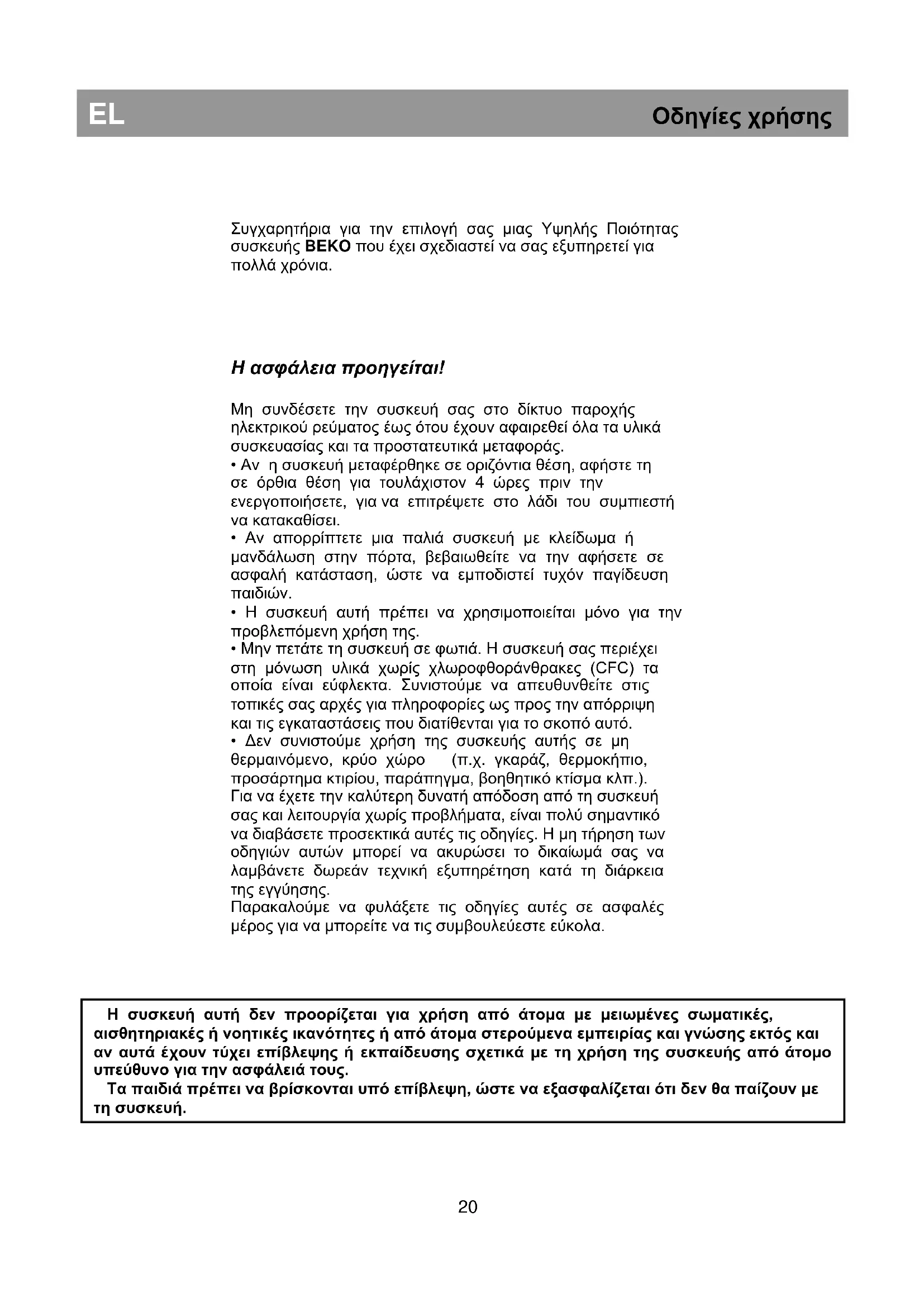 EL Οδηγίες χρήσης Η συσκευή αυτή δεν προορίζεται για χρήση από άτομα με μειωμένες σωματικές, αισθητηριακές ή νοητικές ικανότητες ή από άτομα στερούμενα εμπειρίας και γνώσης εκτός και αν αυτά έχουν τύχει επίβλεψης ή εκπαίδευσης σχετικά με τη χρήση της συσκευής από άτομο υπεύθυνο για την ασφάλειά τους. Τα παιδιά πρέπει να βρίσκονται υπό επίβλεψη, ώστε να εξασφαλίζεται ότι δεν θα παίζουν με τη συσκευή.Απαιτήσεις παροχής ρεύματος Πριν τοποθετήσετε το φις στην πρίζα τοίχου, βεβαιωθείτε ότι η τάση και η συχνότητα που αναφέρονται στην πινακίδα στοιχείων στο εσωτερικό της συσκευής αντιστοιχούν με τις τιμές του ηλεκτρικού σας δικτύου. Συνιστούμε αυτή η συσκευή να συνδεθεί στην παροχή ρεύματος δικτύου μέσω πρίζας με κατάλληλο διακόπτη και κατάλληλη ασφάλεια, που βρίσκεται σε εύκολα προσπελάσιμη θέση. Προειδοποίηση! Η συσκευή αυτή πρέπει να