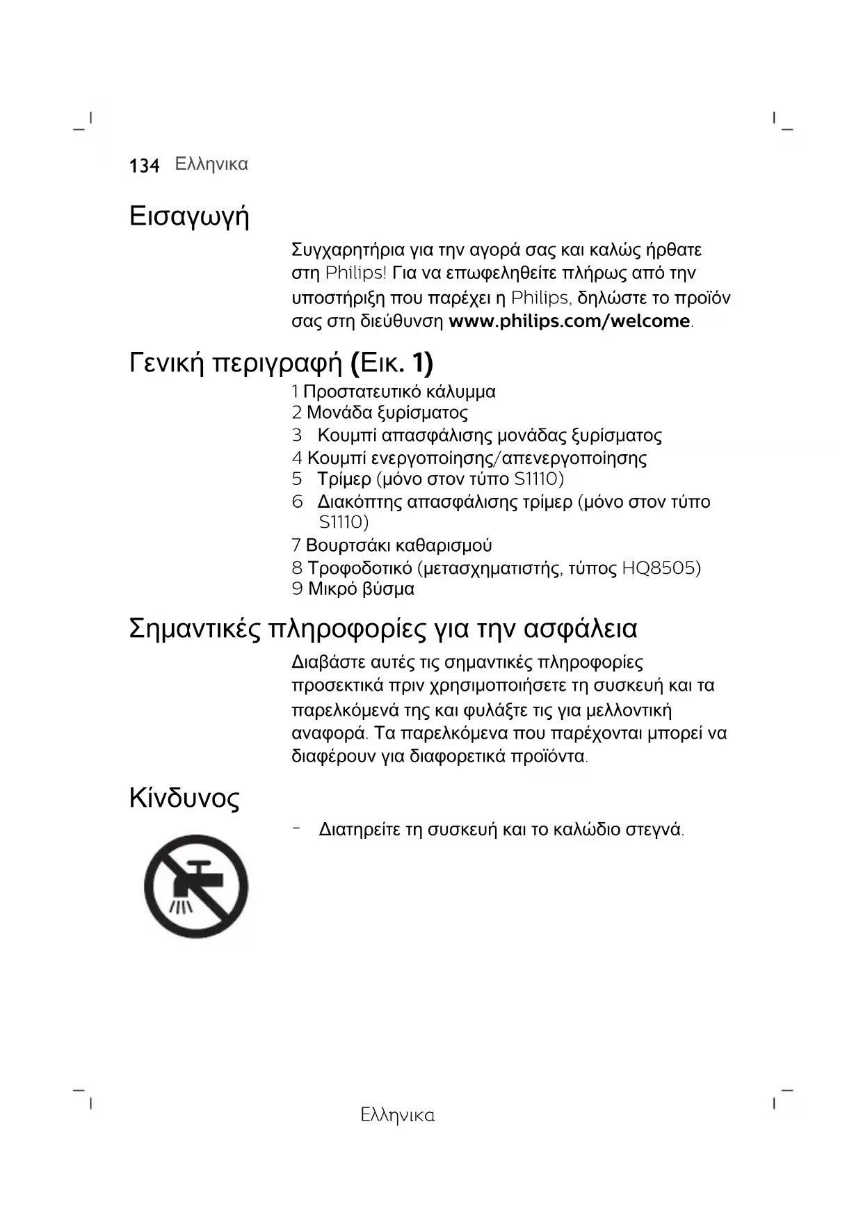 Συγχαρητήρια για την αγορά σας και καλώς ήρθατε στη Philips! Για να επωφεληθείτε πλήρως από την υποστήριξη που παρέχει η Philips, δηλώστε το προϊόν σας στη διεύθυνση www.philips.com/welcome. Γενική περιγραφή (Εικ. 1) 1 Προστατευτικό κάλυμμα 2 Μονάδα ξυρίσματος 3 Κουμπί απασφάλισης μονάδας ξυρίσματος 4 Κουμπί ενεργοποίησης/απενεργοποίησης 5 Τρίμερ (μόνο στον τύπο S1110) 6 Διακόπτης απασφάλισης τρίμερ (μόνο στον τύπο S1110) 7 Βουρτσάκι καθαρισμού 8 Τροφοδοτικό (μετασχηματιστής, τύπος HQ8505) 9 Μικρό βύσμα Σημαντικές πληροφορίες για την ασφάλεια Διαβάστε αυτές τις σημαντικές πληροφορίες προσεκτικά πριν χρησιμοποιήσετε τη συσκευή και τα παρελκόμενά της και φυλάξτε τις για μελλοντική αναφορά. Τα παρελκόμενα που παρέχονται μπορεί να διαφέρουν για διαφορετικά προϊόντα.