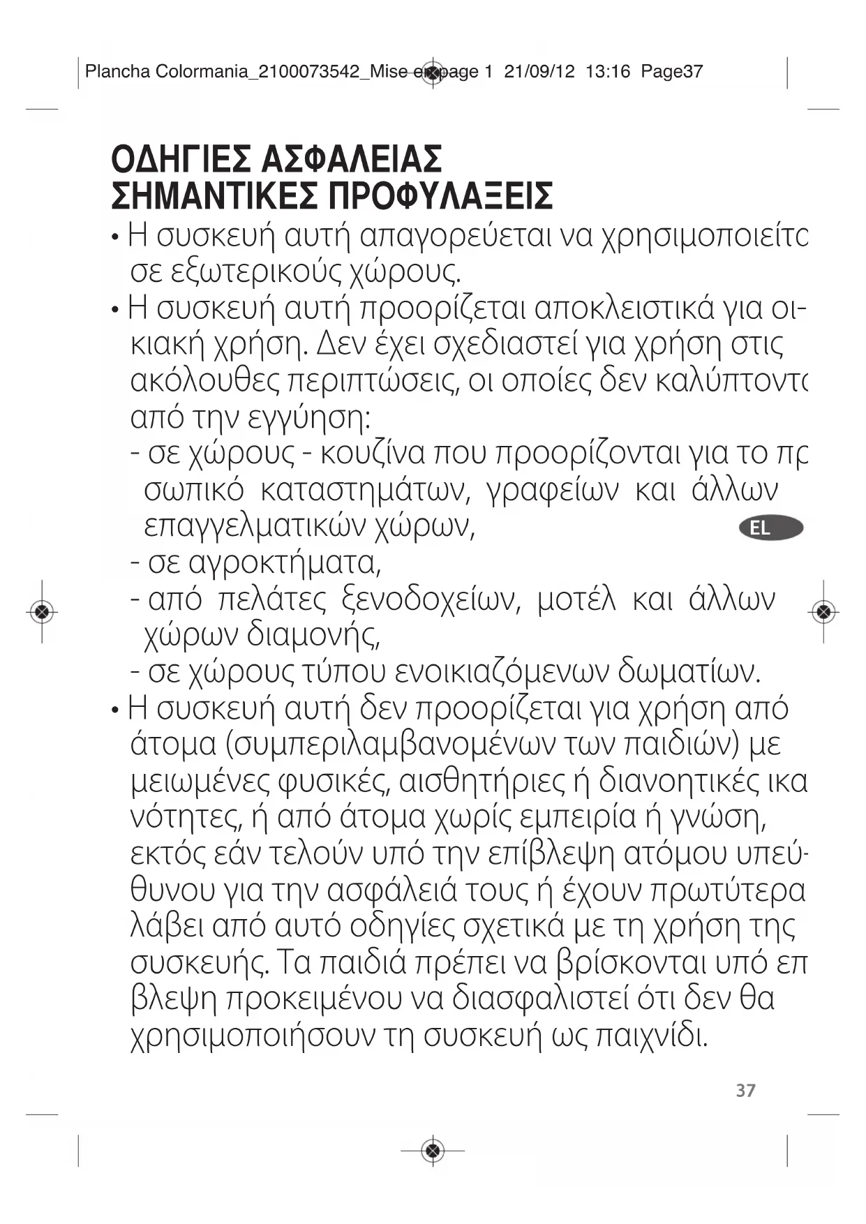 - Η συσκευή αυτή δεν προορίζεται για χρήση από άτομα (συμπεριλαμβανομένων των παιδιών) με μειωμένες φυσικές, αισθητήριες ή διανοητικές ικα- νότητες, ή από άτομα χωρίς εμπειρία ή γνώση, εκτός εάν τελούν υπό την επίβλεψη ατόμου υπεύ- θυνου για την ασφάλειά τους ή έχουν πρωτύτερα λάβει από αυτό οδηγίες σχετικά με τη χρήση της συσκευής. Τα παιδιά πρέπει να βρίσκονται υπό επί- βλεψη προκειμένου να διασφαλιστεί ότι δεν θα χρησιμοποιήσουν τη συσκευή ως παιχνίδι. Plancha Colormania_2100073542_Mise en page 1 21/09/12 13:16 Page3738
