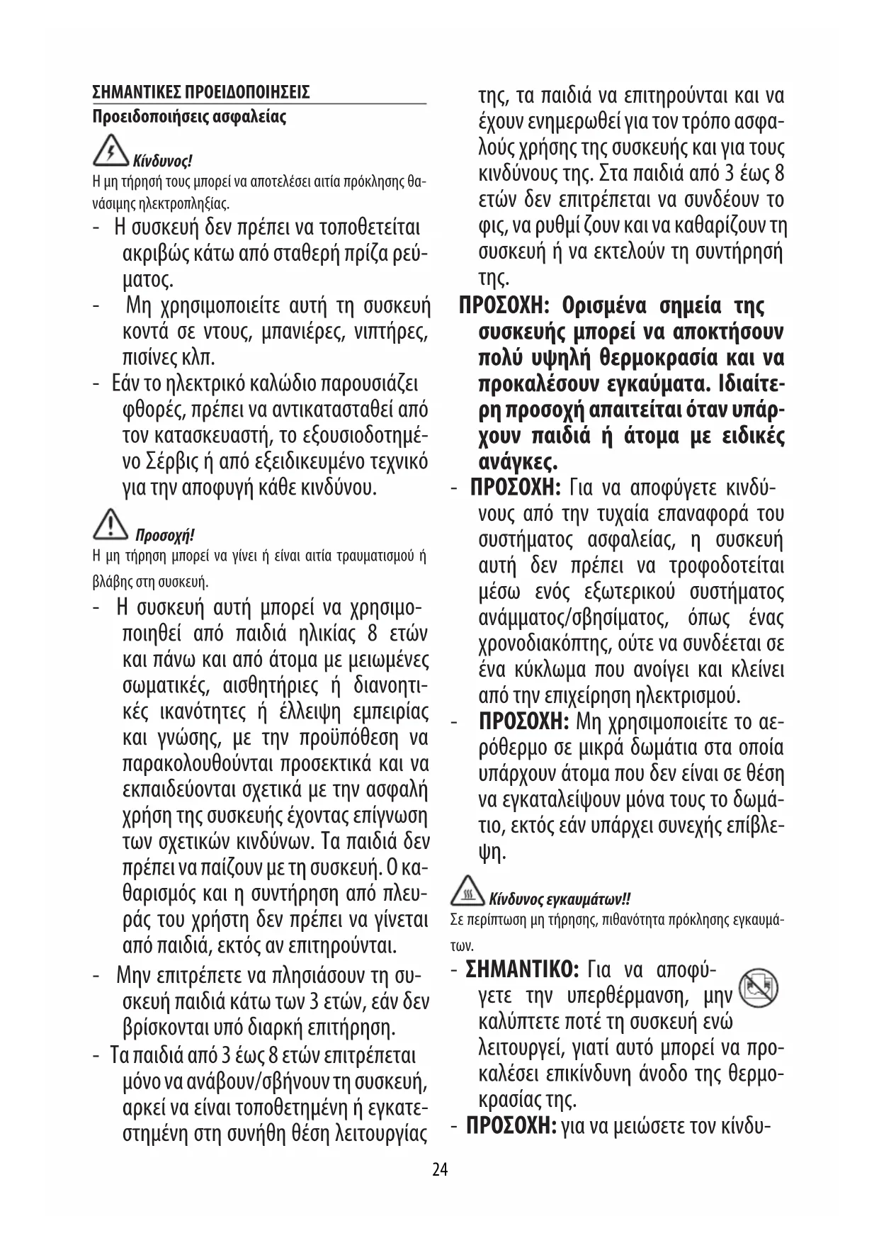 Η μη τήρηση μπορεί να γίνει ή είναι αιτία τραυματισμού ή βλάβης στη συσκευή. - Η συσκευή αυτή μπορεί να χρησιμο- ποιηθεί από παιδιά ηλικίας 8 ετών και πάνω και από άτομα με μειωμένες σωματικές, αισθητήριες ή διανοητι- κές ικανότητες ή έλλειψη εμπειρίας και γνώσης, με την προϋπόθεση να παρακολουθούνται προσεκτικά και να εκπαιδεύονται σχετικά με την ασφαλή χρήση της συσκευής έχοντας επίγνωση των σχετικών κινδύνων. Τα παιδιά δεν πρέπει να παίζουν με τη συσκευή. Ο κα- θαρισμός και η συντήρηση από πλευ- ράς του χρήστη δεν πρέπει να γίνεται από παιδιά, εκτός αν επιτηρούνται. - Μην επιτρέπετε να πλησιάσουν τη συ- σκευή παιδιά κάτω των 3 ετών, εάν δεν βρίσκονται υπό διαρκή επιτήρηση. - Τα παιδιά από 3 έως 8 ετών επιτρέπεται μόνο να ανάβουν/σβήνουν τη συσκευή, αρκεί να είναι τοποθετημένη ή εγκατε- στημένη στη συνήθη θέση λειτουργίας της, τα παιδιά να επιτηρούνται και να έχουν ενημερωθεί για τον τρόπο ασφα- λούς χρήσης της συσκευής και για τους κινδύνους της. Στα παιδιά από 3 έως 8 ετών δεν επιτρέπεται να συνδέουν το φις, να ρυθμί ζουν και να καθαρίζουν τη συσκευή ή να εκτελούν τη συντήρησή