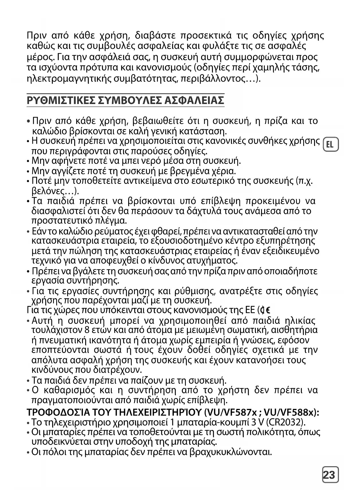 - Ο καθαρισμός και η συντήρηση από το χρήστη δεν πρέπει να πραγματοποιούνται από παιδιά χωρίς επίβλεψη. ΤΡΟΦΟΔΟΣΊΑ ΤΟΥ ΤΗΛΕΧΕΙΡΙΣΤΗΡΊΟΥ (VU/VF587x ; VU/VF588x):
