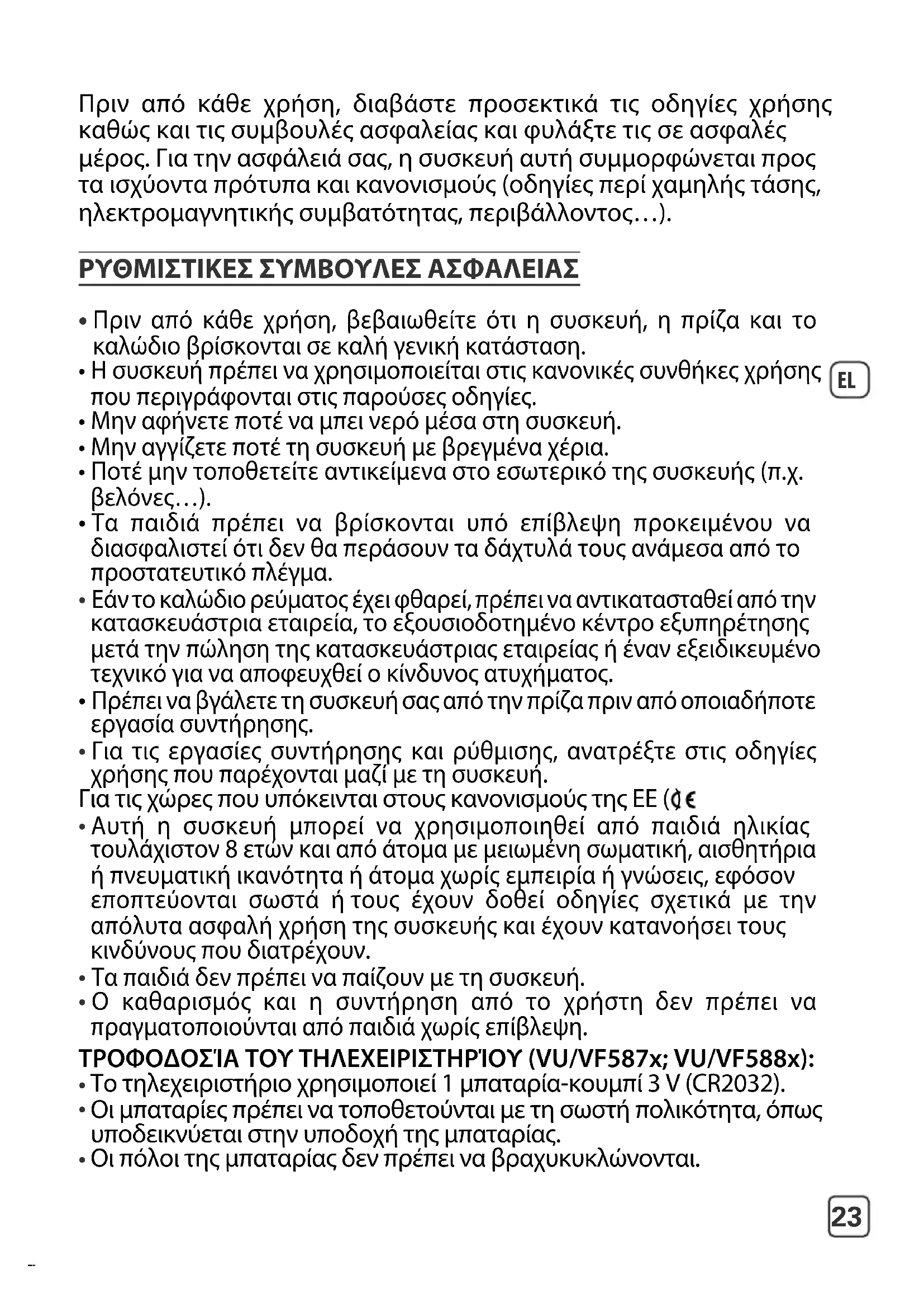 - Ο καθαρισμός και η συντήρηση από το χρήστη δεν πρέπει να πραγματοποιούνται από παιδιά χωρίς επίβλεψη. ΤΡΟΦΟΔΟΣΊΑ ΤΟΥ ΤΗΛΕΧΕΙΡΙΣΤΗΡΊΟΥ (VU/VF587x; VU/VF588x):