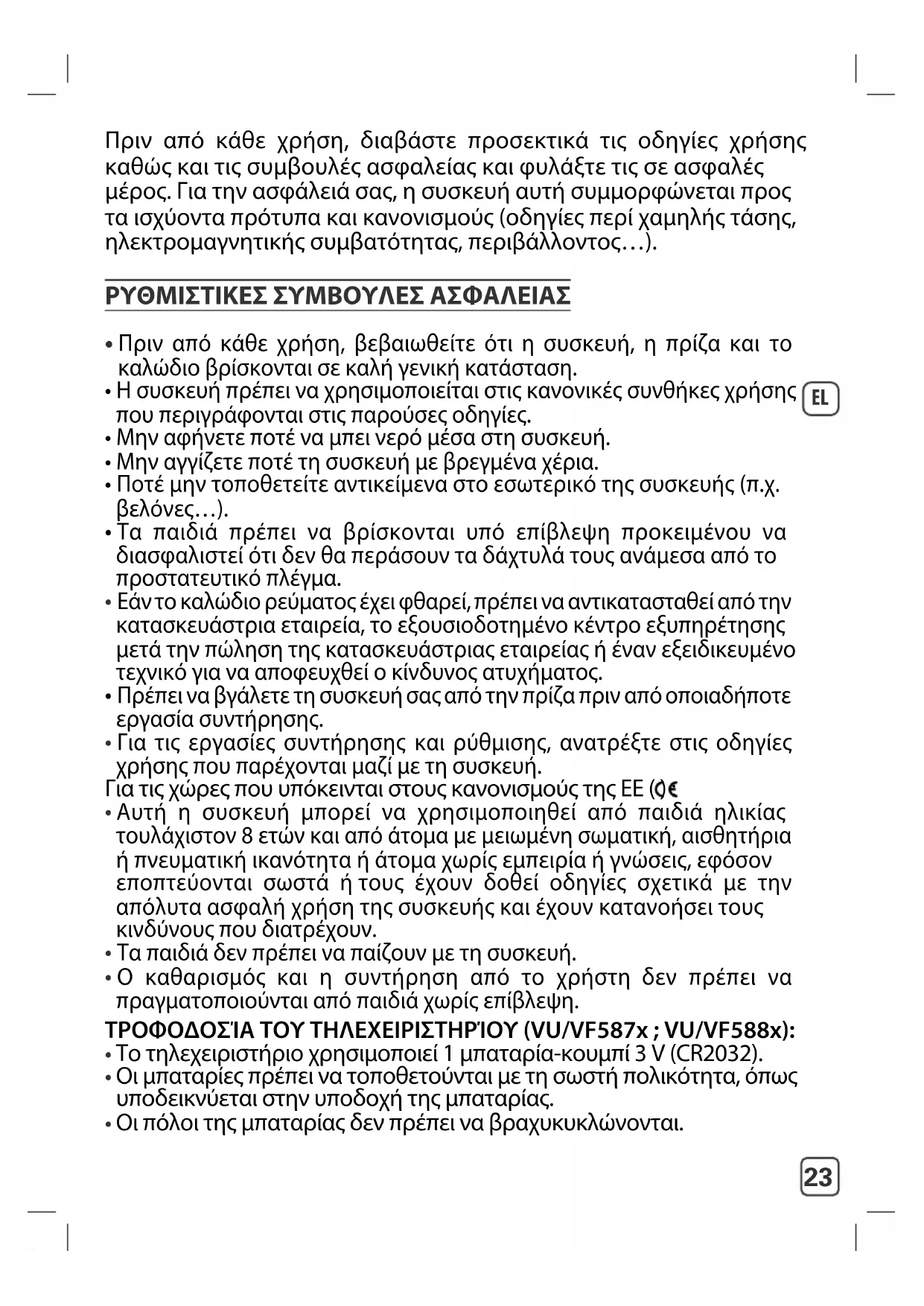 Πριν από κάθε χρήση, διαβάστε προσεκτικά τις οδηγίες χρήσης καθώς και τις συμβουλές ασφαλείας και φυλάξτε τις σε ασφαλές μέρος. Για την ασφάλειά σας, η συσκευή αυτή συμμορφώνεται προς τα ισχύοντα πρότυπα και κανονισμούς (οδηγίες περί χαμηλής τάσης, ηλεκτρομαγνητικής συμβατότητας, περιβάλλοντος…). ΡΥΘΜΙΣΤΙΚΕΣ ΣΥΜΒΟΥΛΕΣ ΑΣΦΑΛΕΙΑΣ