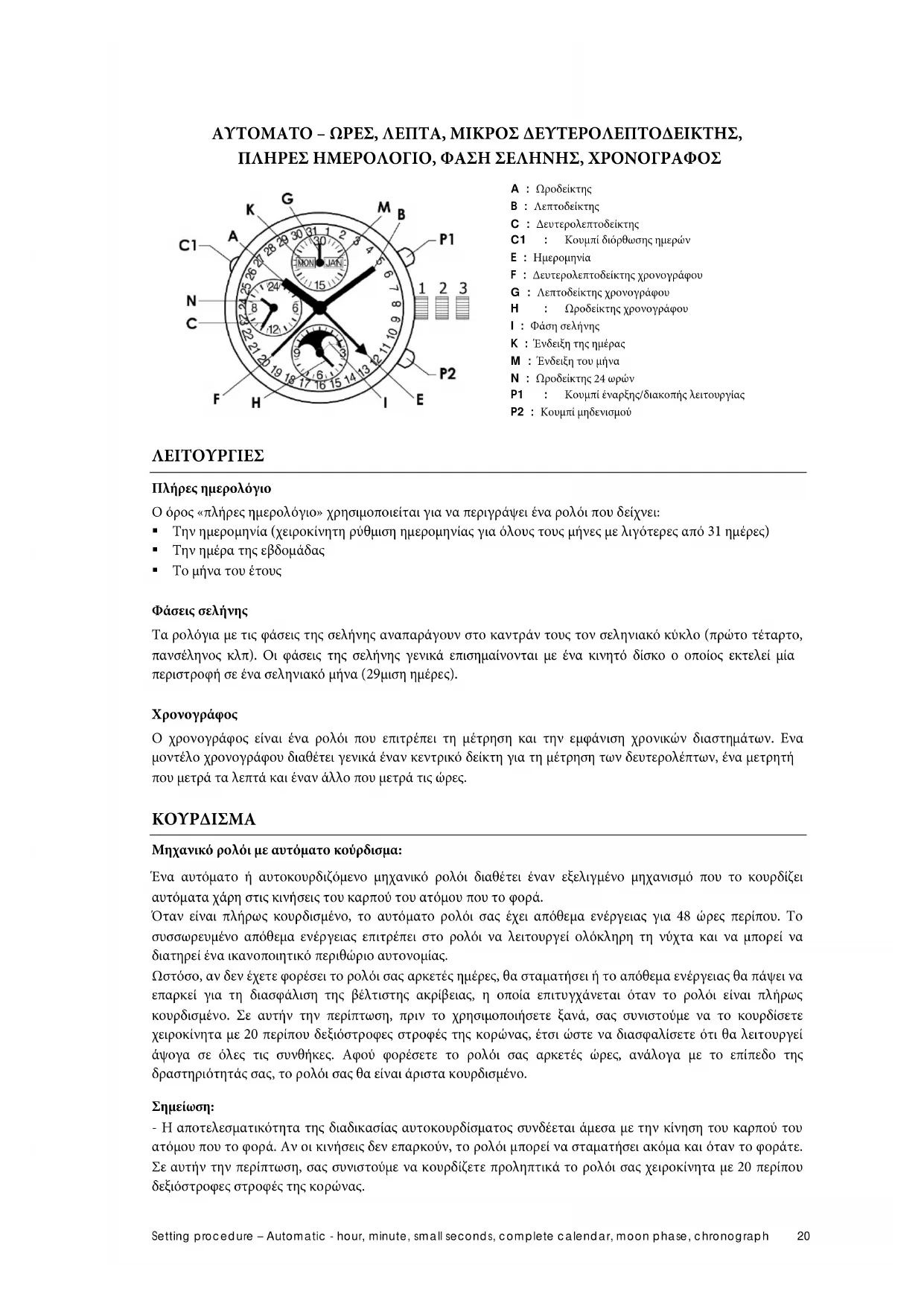 A : Ωροδείκτης B : Λεπτοδείκτης C : Δευτερολεπτοδείκτης C1 : Κουμπί διόρθωσης ημερών E : Ημερομηνία F : Δευτερολεπτοδείκτης χρονογράφου G : Λεπτοδείκτης χρονογράφου H : Ωροδείκτης χρονογράφου I : Φάση σελήνης K : Ένδειξη της ημέρας M : Ένδειξη του μήνα N : Ωροδείκτης 24 ωρών P1 : Κουμπί έναρξης/διακοπής λειτουργίας P2 : Κουμπί μηδενισμού