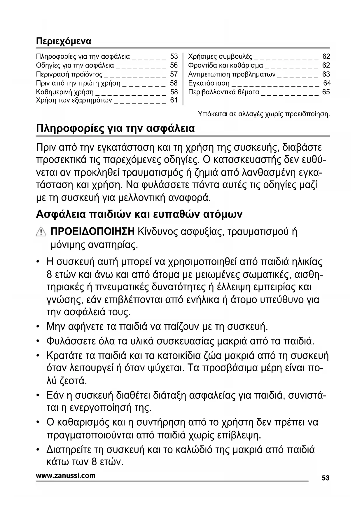 www.zanussi.comΠεριεχόμενα Πληροφορίες για την ασφάλεια _ _ _ _ _ _ 53 Οδηγίες για την ασφάλεια _ _ _ _ _ _ _ _ _ 56 Περιγραφή προϊόντος _ _ _ _ _ _ _ _ _ _ _ 57 Πριν από την πρώτη χρήση _ _ _ _ _ _ _ 58 Καθημερινή χρήση _ _ _ _ _ _ _ _ _ _ _ _ 58 Χρήση των εξαρτημάτων _ _ _ _ _ _ _ _ _ 61 Χρήσιμες συμβουλές _ _ _ _ _ _ _ _ _ _ _ 62 Φροντίδα και καθάρισμα _ _ _ _ _ _ _ _ _ 62 Αντιμετωπιση προβληματων _ _ _ _ _ _ _ 63 Εγκατάσταση _ _ _ _ _ _ _ _ _ _ _ _ _ _ _ 64 Περιβαλλοντικά θέματα _ _ _ _ _ _ _ _ _ _ 65 Υπόκειται αε αλλαγές χωρίς προειδποίηση. Πληροφορίες για την ασφάλεια Πριν από την εγκατάσταση και τη χρήση της συσκευής, διαβάστε προσεκτικά τις παρεχόμενες οδηγίες. Ο κατασκευαστής δεν ευθύ- νεται αν προκληθεί τραυματισμός ή ζημιά από λανθασμένη εγκα- τάσταση και χρήση. Να φυλάσσετε πάντα αυτές τις οδηγίες μαζί με τη συσκευή για μελλοντική αναφορά. Ασφάλεια παιδιών και ευπαθών ατόμων ΠΡΟΕΙΔΟΠΟΙΗΣΗ Κίνδυνος ασφυξίας, τραυματισμού ή μόνιμης αναπηρίας.