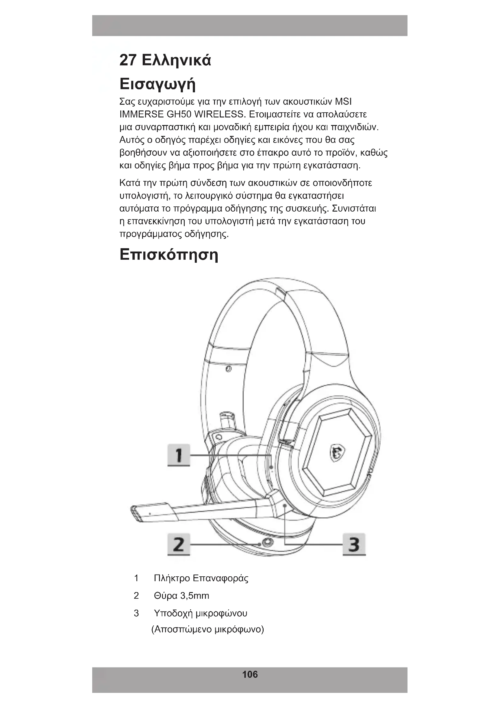 Σας ευχαριστούμε για την επιλογή των ακουστικών MSI IMMERSE GH50 WIRELESS. Ετοιμαστείτε να απολαύσετε μια συναρπαστική και μοναδική εμπειρία ήχου και παιχνιδιών. Αυτός ο οδηγός παρέχει οδηγίες και εικόνες που θα σας βοηθήσουν να αξιοποιήσετε στο έπακρο αυτό το προϊόν, καθώς και οδηγίες βήμα προς βήμα για την πρώτη εγκατάσταση. Κατά την πρώτη σύνδεση των ακουστικών σε οποιονδήποτε υπολογιστή, το λειτουργικό σύστημα θα εγκαταστήσει αυτόματα το πρόγραμμα οδήγησης της συσκευής. Συνιστάται η επανεκκίνηση του υπολογιστή μετά την εγκατάσταση του προγράμματος οδήγησης. Επισκόπηση106 107 4 Ρύθμιση έντασης ήχου 5 Κουμπί σίγασης/Σύζευξης μικροφώνου 6 Κουμπί λειτουργίας 7 Θύρα φόρτισης (USB-C) 8 Ένδειξη κατάστασης φόρτισης 9 Καλώδιο ήχου 3,5mm 10 Καλώδιο φόρτισης 11 Ένδειξη κατάστασης πομπού 12 Κουμπί σύζευξης πομπού108
