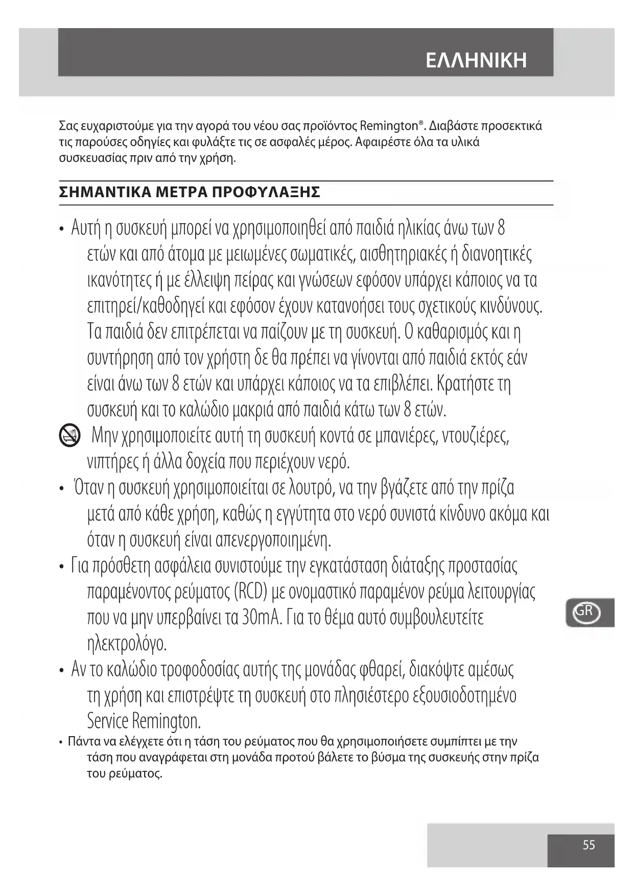 Σας ευχαριστούμε για την αγορά του νέου σας προϊόντος Remington®. Διαβάστε προσεκτικά τις παρούσες οδηγίες και φυλάξτε τις σε ασφαλές μέρος. Αφαιρέστε όλα τα υλικά συσκευασίας πριν από την χρήση. ΣΗΜΑΝΤΙΚΑ ΜΕΤΡΑ ΠΡΟΦΥΛΑΞΗΣ