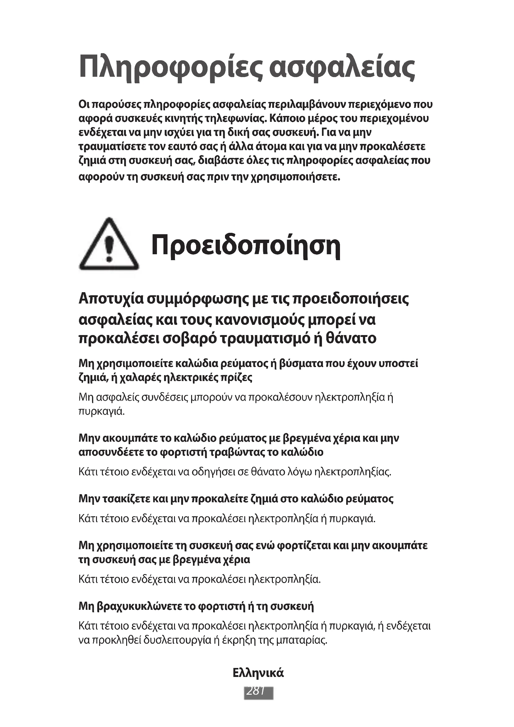Πληροφορίες ασφαλείας Οι παρούσες πληροφορίες ασφαλείας περιλαμβάνουν περιεχόμενο που αφορά συσκευές κινητής τηλεφωνίας. Κάποιο μέρος του περιεχομένου ενδέχεται να μην ισχύει για τη δική σας συσκευή. Για να μην τραυματίσετε τον εαυτό σας ή άλλα άτομα και για να μην προκαλέσετε ζημιά στη συσκευή σας, διαβάστε όλες τις πληροφορίες ασφαλείας που αφορούν τη συσκευή σας πριν την χρησιμοποιήσετε. Προειδοποίηση Αποτυχία συμμόρφωσης με τις προειδοποιήσεις ασφαλείας και τους κανονισμούς μπορεί να προκαλέσει σοβαρό τραυματισμό ή θάνατο Μη χρησιμοποιείτε καλώδια ρεύματος ή βύσματα που έχουν υποστεί ζημιά, ή χαλαρές ηλεκτρικές πρίζεςΜη ασφαλείς συνδέσεις μπορούν να προκαλέσουν ηλεκτροπληξία ή πυρκαγιά.Μην ακουμπάτε το καλώδιο ρεύματος με βρεγμένα χέρια και μην αποσυνδέετε το φορτιστή τραβώντας το καλώδιοΚάτι τέτοιο ενδέχεται να οδηγήσει σε θάνατο λόγω ηλεκτροπληξίας.Μην τσακίζετε και μην προκαλείτε ζημιά στο καλώδιο ρεύματοςΚάτι τέτοιο ενδέχεται να προκαλέσει ηλεκτροπληξία ή πυρκαγιά.Μη χρησιμοποιείτε τη συσκευή σας ενώ φορτίζεται και μην ακουμπάτε τη συσκευή σας με βρεγμένα χέριαΚάτι τέτοιο ενδέχεται να προκαλέσει ηλεκτροπληξία.Μη βραχυκυκλώνετε το φορτιστή ή τη συσκευήΚάτι τέτοιο ενδέχεται να προκαλέσει ηλεκτροπληξία ή πυρκαγιά, ή ενδέχεται να προκληθεί δυσλειτουργία ή έκρηξη της μπαταρίας.Ελληνικά