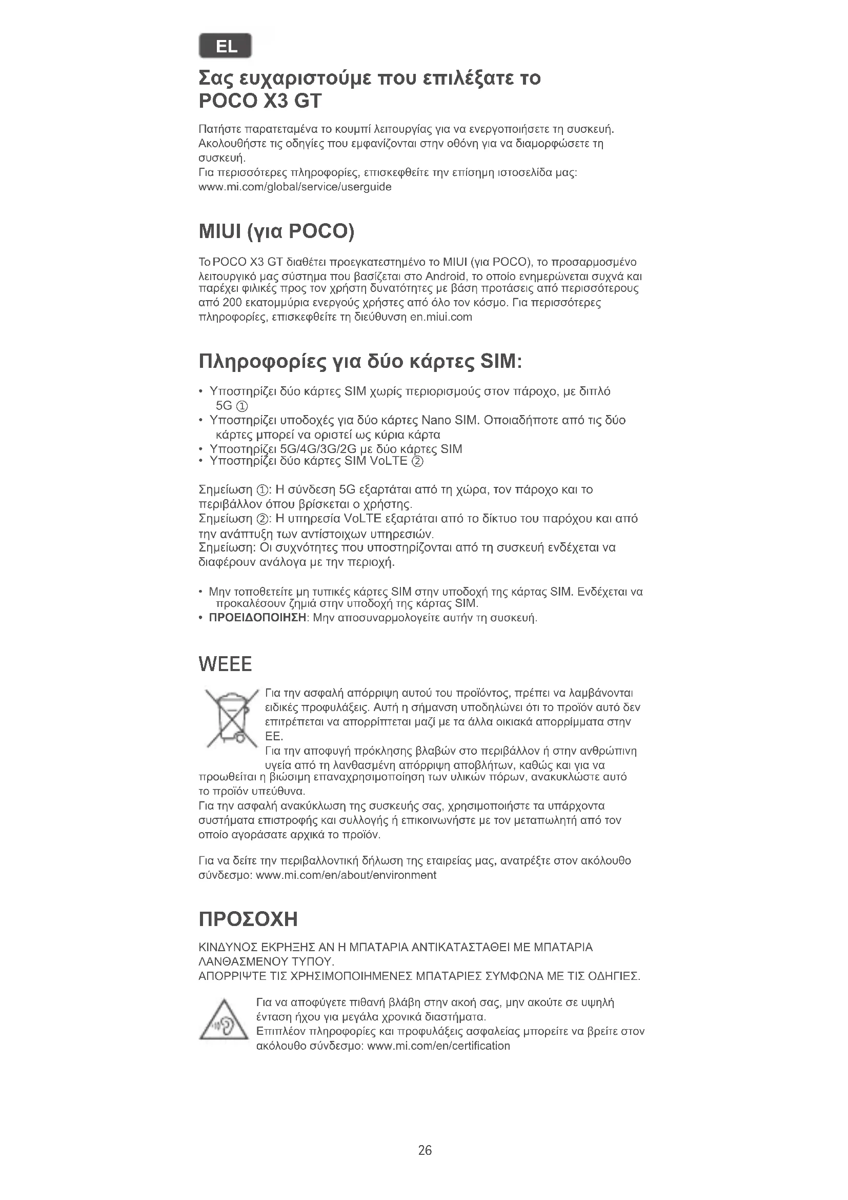 Για περισσότερες πληροφορίες, επισκεφθείτε την επίσημη ιστοσελίδα μας: www.mi.com/global/service/userguide MIUI (για POCO) Το POCO X3 GT διαθέτει προεγκατεστημένο το MIUI (για POCO), το προσαρμοσμένο λειτουργικό μας σύστημα που βασίζεται στο Android, το οποίο ενημερώνεται συχνά και παρέχει φιλικές προς τον χρήστη δυνατότητες με βάση προτάσεις από περισσότερους από 200 εκατομμύρια ενεργούς χρήστες από όλο τον κόσμο. Για περισσότερες πληροφορίες, επισκεφθείτε τη διεύθυνση en.miui.com Πληροφορίες για δύο κάρτες SIM: