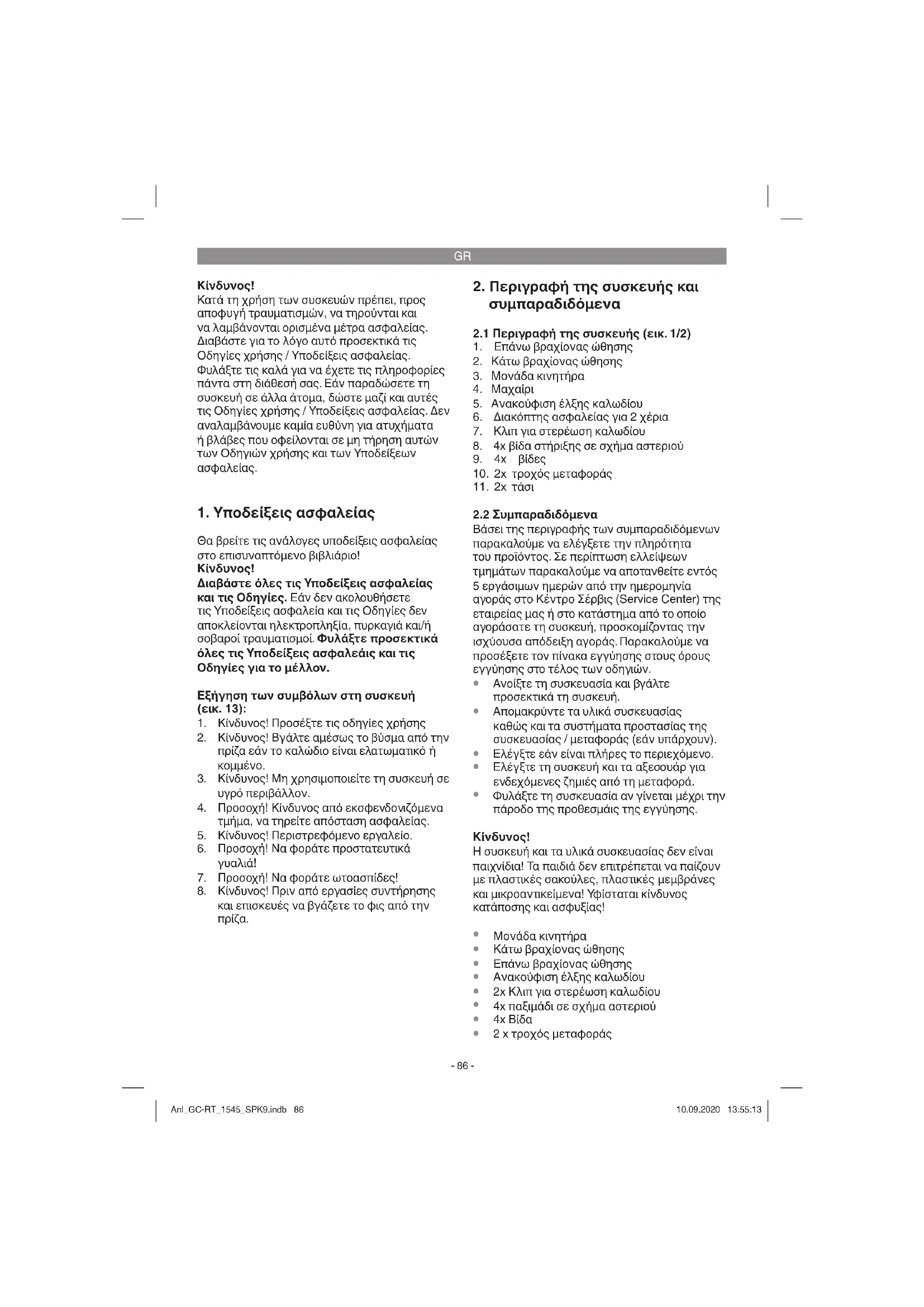 Υπολειπόμενοι κίνδυνοι Aκόμη και σε περίπτωση σωστής και κανονικής χρήσης αυτού του ηλεκτρικού εργαλείου, υφίστανται πάντα ορισμένοι Anl_GC-RT_1545_SPK9.indb 87Anl_GC-RT_1545_SPK9.indb 87 10.09.2020 13:55:1310.09.2020 13:55:13GR