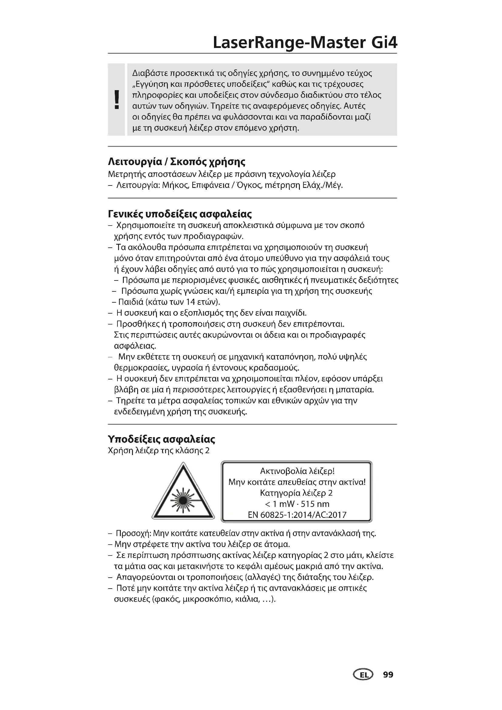 – Μην εκθέτετε τη συσκευή σε μηχανική καταπόνηση, πολύ υψηλές θερμοκρασίες, υγρασία ή έντονους κραδασμούς. – Η συσκευή δεν επιτρέπεται να χρησιμοποιείται πλέον, εφόσον υπάρξει βλάβη σε μία ή περισσότερες λειτουργίες ή εξασθενήσει η μπαταρία. – Τηρείτε τα μέτρα ασφαλείας τοπικών και εθνικών αρχών για την ενδεδειγμένη χρήση της συσκευής. Λειτουργία / Σκοπός χρήσης Μετρητής αποστάσεων λέιζερ με πράσινη τεχνολογία λέιζερ – Λειτουργία: Μήκος, Επιφάνεια / Όγκος, mέτρηση Ελάχ./Mέγ. Διαβάστε προσεκτικά τις οδηγίες χρήσης, το συνημμένο τεύχος „Εγγύηση και πρόσθετες υποδείξεις“ καθώς και τις τρέχουσες πληροφορίες και υποδείξεις στον σύνδεσμο διαδικτύου στο τέλος αυτών των οδηγιών. Τηρείτε τις αναφερόμενες οδηγίες. Αυτές οι οδηγίες θα πρέπει να φυλάσσονται και να παραδίδονται μαζί με τη συσκευή λέιζερ στον επόμενο χρήστη. !100