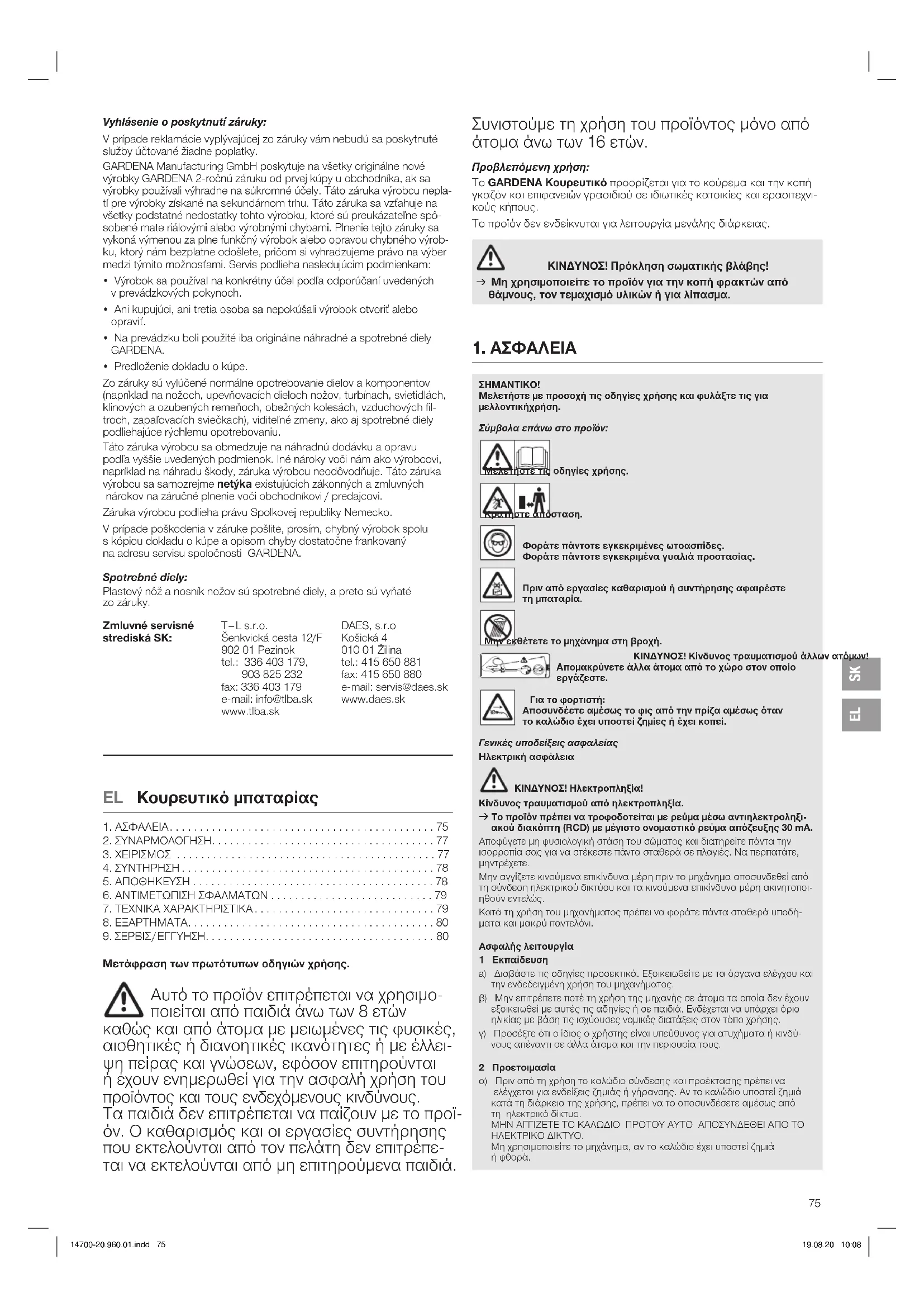 Παρακαλούμε επικοινωνήστε με τη διεύθυνση στην πίσω σελίδα. Δήλωση εγγύησης: Σε περίπτωση αξίωσης εγγύησης, δεν επιβαρύνεστε με χρεώσεις για τις παρεχόμενες υπηρεσίες. Η GARDENA Manufacturing GmbH παρέχει για όλα τα γνήσια καινούρ- για προϊόντα GARDENA εγγύηση 2 ετών από την ημερομηνία της πρώτης αγοράς από τον αντιπρόσωπο, όταν τα προϊόντα χρησιμοποι- ούνται αποκλειστικά για ιδιωτική χρήση. Αυτή η εγγύηση κατασκευα- στή δεν ισχύει για προϊόντα που έχουν αποκτηθεί στη δευτερογενή αγορά. Αυτή η εγγύηση αφορά σε σημα ντικά ελαττώματα του προϊό- ντος που οφείλονται αποδεδειγμένα σε σφάλματα υλικού ή κατα- σκευής. Η παρούσα εγγύηση εκπληρώνεται με την παροχή ενός πλή- ρως λειτουργικού προϊόντος αντικατάστασης ή με τη δωρεάν επισκευή του ελαττωματικού προϊόντος. Διατηρούμε το δικαί ωμα επιλογής. Αυτή η υπηρεσία ισχύει εφόσον πληρούνται οι παρακάτω προϋποθέ-