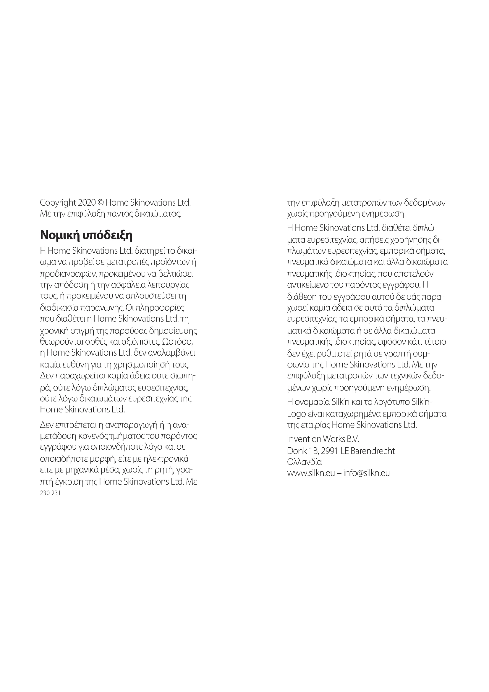 assistência. Nosso serviço de assistência ao cliente sempre terá prazer em ajudar! Serviço de assistência ao cliente Para mais informações sobre os produtos Silk’n, visite o site local da Silk’n em: www.silkn.eu. Se o aparelho estiver danifica- do ou com defeito, precisar de reparo ou de nossa assistência, entre em contacto com o centro de assistência Silk’n mais próximo. Número de serviço: +31(0)180-330550 Email: info@silkn.eu230 231 Copyright 2020 © Home Skinovations Ltd. Με την επιφύλαξη παντός δικαιώματος. Νομική υπόδειξη Η Home Skinovations Ltd. διατηρεί το δικαί- ωμα να προβεί σε μετατροπές προϊόντων ή προδιαγραφών, προκειμένου να βελτιώσει την απόδοση ή την ασφάλεια λειτουργίας τους, ή προκειμένου να απλουστεύσει τη διαδικασία παραγωγής. Οι πληροφορίες που διαθέτει η Home Skinovations Ltd. τη χρονική στιγμή της παρούσας δημοσίευσης θεωρούνται ορθές και αξιόπιστες. Ωστόσο, η Home Skinovations Ltd. δεν αναλαμβάνει καμία ευθύνη για τη χρησιμοποίησή τους. Δεν παραχωρείται καμία άδεια ούτε σιωπη- ρά, ούτε λόγω διπλώματος ευρεσιτεχνίας, ούτε λόγω δικαιωμάτων ευρεσιτεχνίας της Home Skinovations Ltd. Δεν επιτρέπεται η αναπαραγωγή ή η ανα- μετάδοση κανενός τμήματος του παρόντος εγγράφου για οποιονδήποτε λόγο και σε οποιαδήποτε μορφή, είτε με ηλεκτρονικά είτε με μηχανικά μέσα, χωρίς τη ρητή, γρα- πτή έγκριση της Home Skinovations Ltd. Με την επιφύλαξη μετατροπών των δεδομένων χωρίς προηγούμενη ενημέρωση. Η Home Skinovations Ltd. διαθέτει διπλώ- ματα ευρεσιτεχνίας, αιτήσεις χορήγησης δι- πλωμάτων ευρεσιτεχνίας, εμπορικά σήματα, πνευματικά δικαιώματα και άλλα δικαιώματα πνευματικής ιδιοκτησίας, που αποτελούν αντικείμενο του παρόντος εγγράφου. Η διάθεση του εγγράφου αυτού δε σάς παρα- χωρεί καμία άδεια σε αυτά τα διπλώματα ευρεσιτεχνίας, τα εμπορικά σήματα, τα πνευ- ματικά δικαιώματα ή σε άλλα δικαιώματα πνευματικής ιδιοκτησίας, εφόσον κάτι τέτοιο δεν έχει ρυθμιστεί ρητά σε γραπτή συμ- φωνία της Home Skinovations Ltd. Με την επιφύλαξη μετατροπών των τεχνικών δεδο- μένων χωρίς προηγούμενη ενημέρωση. Η ονομασία Silk’n και το λογότυπο Silk’n- Logo είναι καταχωρημένα εμπορικά σήματα της εταιρίας Home Skinovations Ltd. Invention Works B.V. Donk 1B, 2991 LE Barendrecht