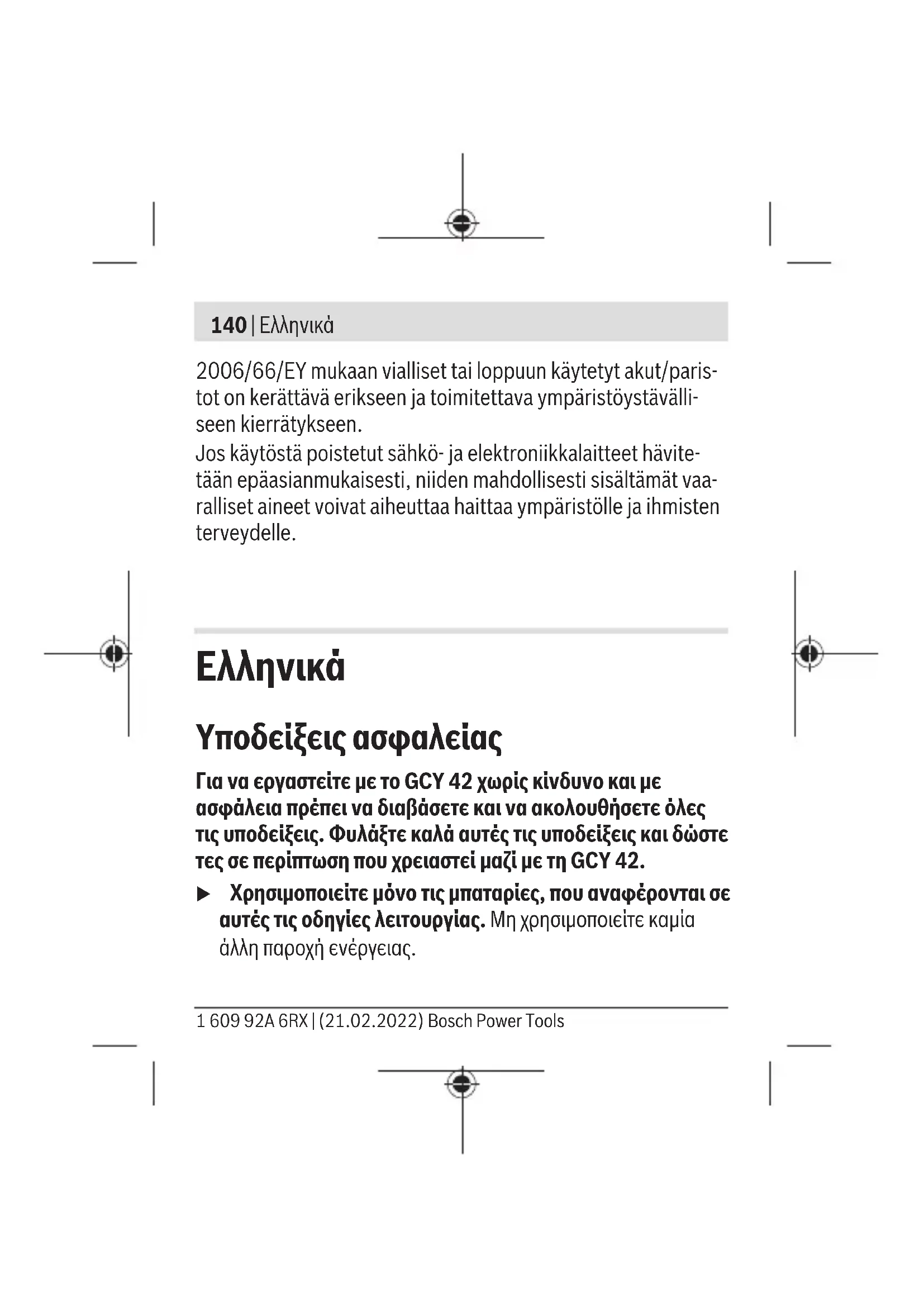 Υποδείξεις ασφαλείας Για να εργαστείτε με τοGCY42 χωρίς κίνδυνο και με ασφάλεια πρέπει να διαβάσετε και να ακολουθήσετε όλες τις υποδείξεις. Φυλάξτε καλά αυτές τις υποδείξεις και δώστε τες σε περίπτωση που χρειαστεί μαζί με τηGCY42. u Χρησιμοποιείτε μόνο τις μπαταρίες, που αναφέρονται σε αυτές τις οδηγίες λειτουργίας. Μη χρησιμοποιείτε καμία άλλη παροχή ενέργειας. 1 609 92A 6RX | (21.02.2022) Bosch Power ToolsΕλληνικά | 141 ΠΡΟΕΙΔΟΠΟΙΗΣΗ Βεβαιωθείτε, ότι η μπαταρία τύπου κουμπιού δε φθάνει στα χέρια των παιδιών. Οι μπαταρίες τύπου κουμπιού είναι επικίνδυνες. u Οι μπαταρίες τύπου κουμπιού δεν επιτρέπεται ποτέ να καταπoθούν ή να περάσουν μέσα σε άλλη σωματική κοιλότητα. Όταν υπάρχει η υποψία, ότι μια μπαταρία τύπου κουμπιού έχει καταπoθεί ή έχει περάσει μέσα σε μια άλλη σωματική κοιλότητα, επισκεφτείτε αμέσως έναν γιατρό. Μια κατάποση των μπαταριών τύπου κουμπιού μπορεί μέσα σε 2 ώρες να οδηγήσει σε σοβαρά εσωτερικά εγκαύματα και στο θάνατο. u Κατά την αλλαγή της μπαταρίας τύπου κουμπιού προσέχετε την ενδεδειγμένη αντικατάσταση της μπαταρίας τύπου κουμπιού. Υπάρχει κίνδυνος έκρηξης. u Χρησιμοποιείτε μόνο τις μπαταρίες τύπου κουμπιού που αναφέρονται σε αυτές τις οδηγίες λειτουργίας. Μη χρησιμοποιείτε άλλες μπαταρίες τύπου κουμπιού ή μια άλλη πηγή παροχής ενέργειας. u Μην προσπαθήσετε να επαναφορτίσετε την μπαταρία τύπου κουμπιού και μη βραχυκυκλώσετε την μπαταρία Bosch Power Tools 1 609 92A 6RX | (21.02.2022)142 | Ελληνικά τύπου κουμπιού. Η μπαταρία τύπου κουμπιού ενδέχεται να παρουσιάσει διαρροή, να εκραγεί, να πάρει φωτιά και να τραυματίσει άτομα. u Απομακρύνετε και αποσύρετε τι εκφορτισμένες μπαταρίες τύπου κουμπιού σύμφωνα με τους κανονισμούς.Οι εκφορτισμένες μπαταρίες τύπου κουμπιού μπορούν να παρουσιάσουν διαρροή και να προξενήσουν έτσι ζημιά στο προϊόν ή να τραυματίσουν άτομα. u Μην υπερθερμαίνετε την μπαταρία τύπου κουμπιού και μην την ρίχνετε στη φωτιά. Η μπαταρία τύπου κουμπιού ενδέχεται να παρουσιάσει διαρροή, να εκραγεί, να πάρει φωτιά και να τραυματίσει άτομα. u Μην προξενήσετε ζημιά στην μπαταρία τύπου κουμπιού και μην ανοίξετε την μπαταρία τύπου κουμπιού. Η μπαταρία τύπου κουμπιού ενδέχεται να παρουσιάσει διαρροή, να εκραγεί, να πάρει φωτιά και να τραυματίσει