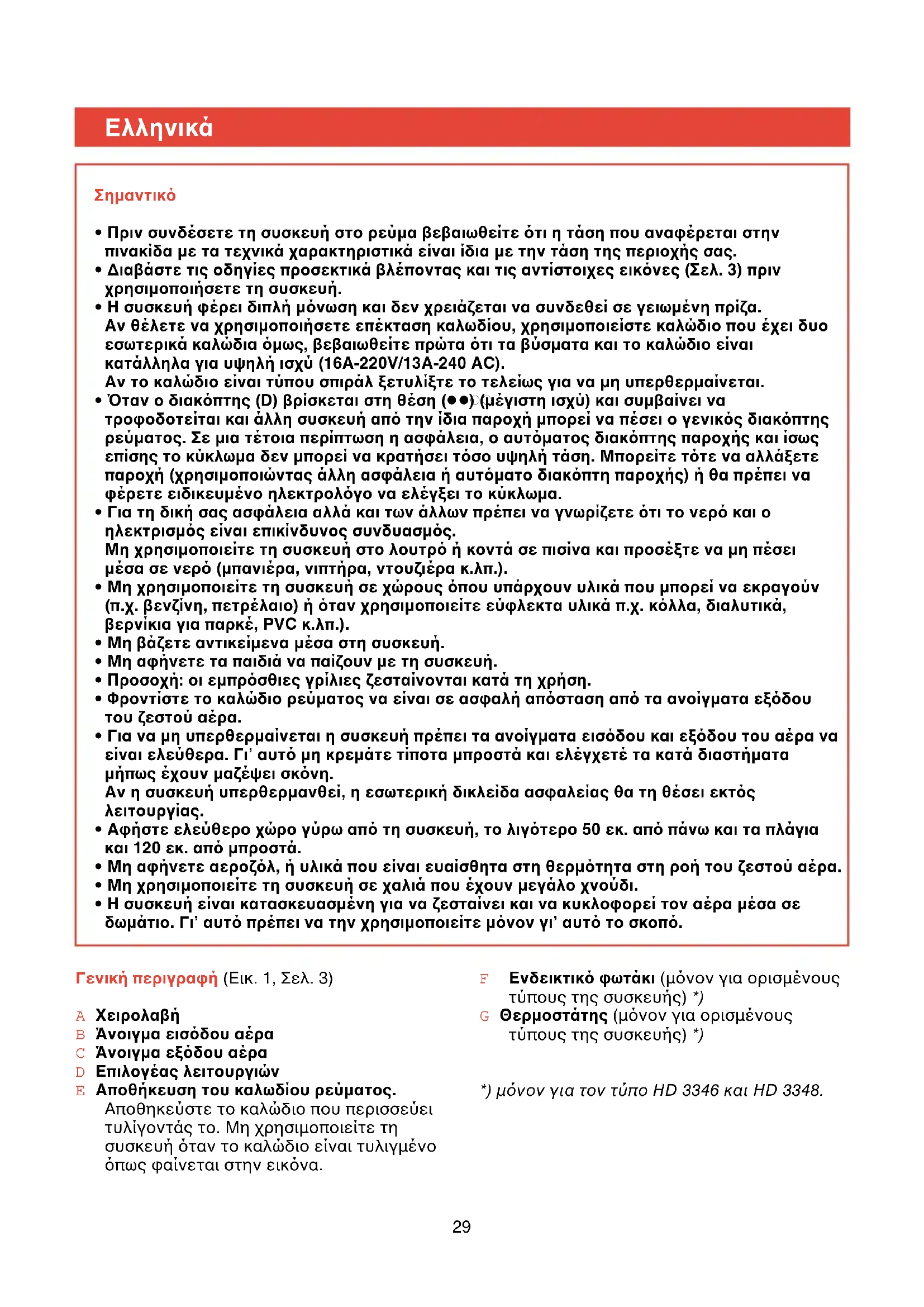- H συσκευή είναι κατασκευασµένη για να ζεσταίνει και να κυκλοφορεί τον αέρα µέσα σε δωµάτιο. Γι’ αυτ πρέπει να την χρησιµοποιείτε µνον γι’ αυτ το σκοπ. F Eνδεικτικ φωτάκι (µ'νον για ορισµένους τύπους της συσκευής) *) G Θερµοστάτης (µ'νον για ορισµένους τύπους της συσκευής) *) *) µνον για τον τύπο HD 3346 και HD 3348.30 Aσφαλής τοποθέτηση της συσκευής (Bλέπε επίσης «σηµαντικ»)