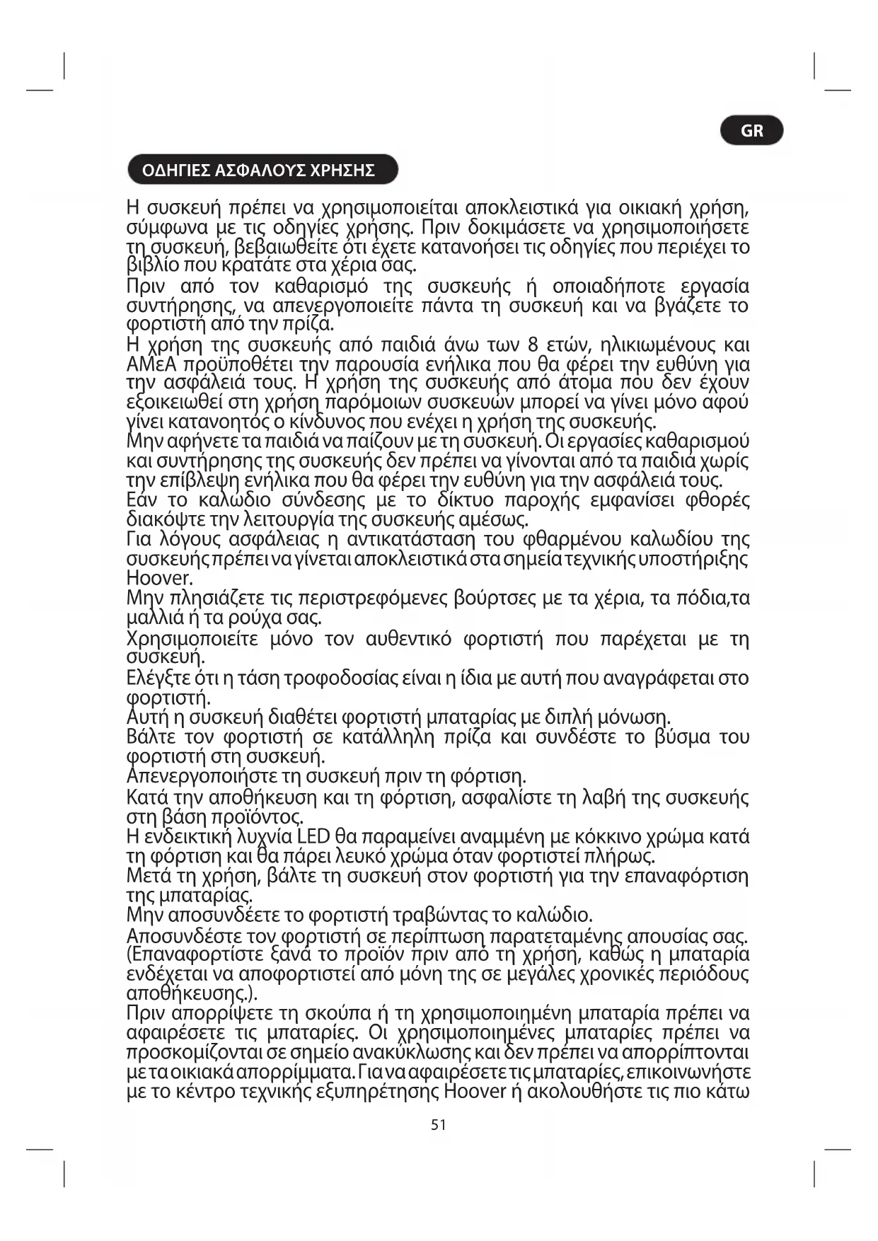 H συσκευή πρέπει να χρησιμοποιείται αποκλειστικά για οικιακή χρήση, σύμφωνα με τις οδηγίες χρήσης. Πριν δοκιμάσετε να χρησιμοποιήσετε τη συσκευή, βεβαιωθείτε ότι έχετε κατανοήσει τις οδηγίες που περιέχει το βιβλίο που κρατάτε στα χέρια σας. Πριν από τον καθαρισμό της συσκευής ή οποιαδήποτε εργασία συντήρησης, να απενεργοποιείτε πάντα τη συσκευή και να βγάζετε το φορτιστή από την πρίζα. Η χρήση της συσκευής από παιδιά άνω των 8 ετών, ηλικιωμένους και ΑΜεΑ προϋποθέτει την παρουσία ενήλικα που θα φέρει την ευθύνη για την ασφάλειά τους. Η χρήση της συσκευής από άτομα που δεν έχουν εξοικειωθεί στη χρήση παρόμοιων συσκευών μπορεί να γίνει μόνο αφού γίνει κατανοητός ο κίνδυνος που ενέχει η χρήση της συσκευής. Μην αφήνετε τα παιδιά να παίζουν με τη συσκευή. Οι εργασίες καθαρισμού και συντήρησης της συσκευής δεν πρέπει να γίνονται από τα παιδιά χωρίς την επίβλεψη ενήλικα που θα φέρει την ευθύνη για την ασφάλειά τους. Εάν το καλώδιο σύνδεσης με το δίκτυο παροχής εμφανίσει φθορές διακόψτε την λειτουργία της συσκευής αμέσως. Για λόγους ασφάλειας η αντικατάσταση του φθαρμένου καλωδίου της συσκευής πρέπει να γίνεται αποκλειστικά στα σημεία τεχνικής υποστήριξης Hoover. Μην πλησιάζετε τις περιστρεφόμενες βούρτσες με τα χέρια, τα πόδια,τα μαλλιά ή τα ρούχα σας. Χρησιμοποιείτε μόνο τον αυθεντικό φορτιστή που παρέχεται με τη