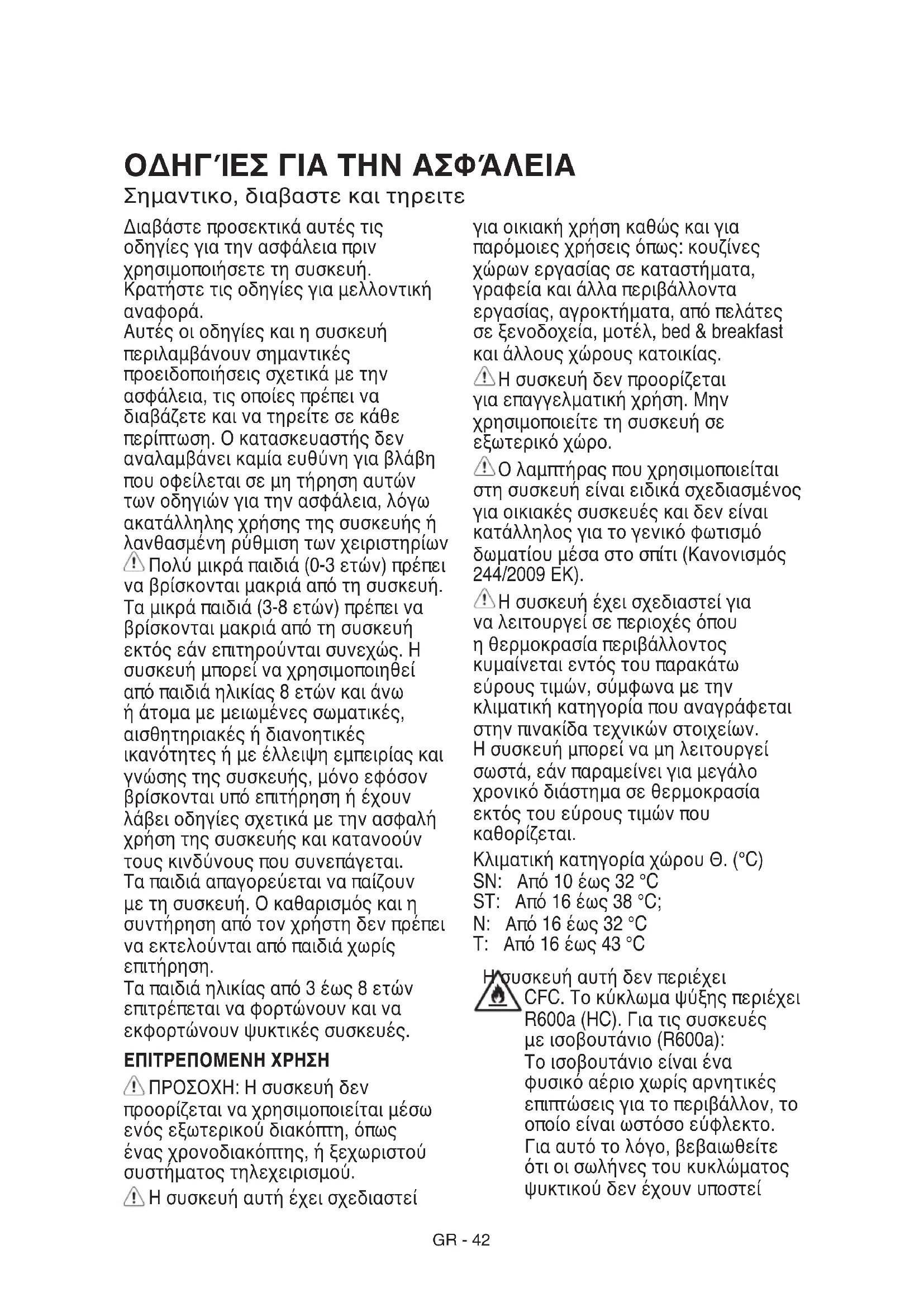 Ταπαιδιάηλικίαςαπό3έως8ετών επιτρέπεταιναφορτώνουνκαινα εκφορτώνουνψυκτικέςσυσκευές. ΕΠΙΤΡΕΠΟΜΕΝΗ ΧΡΗΣΗ ΠΡΟΣΟΧΗ:Ησυσκευήδεν προορίζεταιναχρησιμοποιείταιμέσω ενόςεξωτερικούδιακόπτη,όπως έναςχρονοδιακόπτης,ήξεχωριστού συστήματοςτηλεχειρισμού. Ησυσκευήαυτήέχεισχεδιαστεί γιαοικιακήχρήσηκαθώςκαιγια παρόμοιεςχρήσειςόπως:κουζίνες χώρωνεργασίαςσεκαταστήματα, γραφείακαιάλλαπεριβάλλοντα εργασίας,αγροκτήματα,απόπελάτες σεξενοδοχεία,μοτέλ,bed&breakfast καιάλλουςχώρουςκατοικίας. Ησυσκευήδενπροορίζεται γιαεπαγγελματικήχρήση.Μην χρησιμοποιείτετησυσκευήσε εξωτερικόχώρο. Ολαμπτήραςπουχρησιμοποιείται στησυσκευήείναιειδικάσχεδιασμένος γιαοικιακέςσυσκευέςκαιδενείναι κατάλληλοςγιατογενικόφωτισμό δωματίουμέσαστοσπίτι(Κανονισμός 244/2009ΕΚ). Ησυσκευήέχεισχεδιαστείγια ναλειτουργείσεπεριοχέςόπου ηθερμοκρασίαπεριβάλλοντος κυμαίνεταιεντόςτουπαρακάτω εύρουςτιμών,σύμφωναμετην κλιματικήκατηγορίαπουαναγράφεται στηνπινακίδατεχνικώνστοιχείων. Ησυσκευήμπορείναμηλειτουργεί σωστά,εάνπαραμείνειγιαμεγάλο χρονικόδιάστημασεθερμοκρασία εκτόςτουεύρουςτιμώνπου καθορίζεται. ΚλιματικήκατηγορίαχώρουΘ.(°C) SN: Από10έως32°C ST: Από16έως38°C; N: Από16έως32°C T: Από16έως43°C Ησυσκευήαυτήδενπεριέχει CFC.Τοκύκλωμαψύξηςπεριέχει R600a(HC).Γιατιςσυσκευές μεισοβουτάνιο(R600a): Τοισοβουτάνιοείναιένα φυσικόαέριοχωρίςαρνητικές επιπτώσειςγιατοπεριβάλλον,το οποίοείναιωστόσοεύφλεκτο. Γιααυτότολόγο,βεβαιωθείτε ότιοισωλήνεςτουκυκλώματος ψυκτικούδενέχουνυποστείGR-43 ζημιά,ειδικότεραόταναδειάζετε τοκύκλωμαψυκτικού. ΠΡΟΕΙΔΟΠΟΙΗΣΗ:Φροντίστενα μηνπροκληθείζημιάστουςσωλήνες τουκυκλώματοςψυκτικούτης