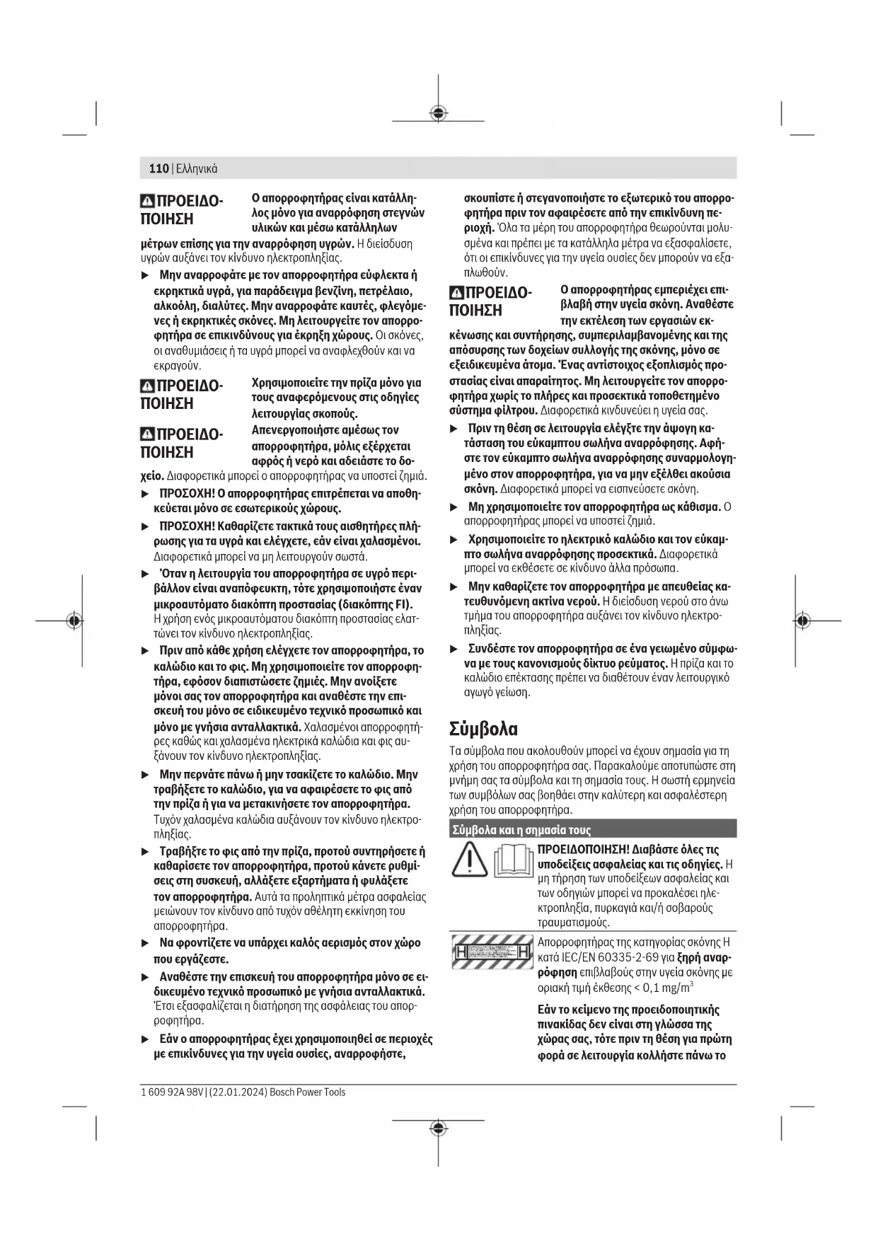 Εάν το κείμενο της προειδοποιητικής πινακίδας δεν είναι στη γλώσσα της χώρας σας, τότε πριν τη θέση για πρώτη φορά σε λειτουργία κολλήστε πάνω το 1 609 92A 98V | (22.01.2024) Bosch Power ToolsΕλληνικά | 111 Σύμβολα και η σημασία τους συμπαραδιδόμενο αυτοκόλλητο στη γλώσσα της χώρας σας. ΠΡΟΕΙΔΟΠΟΙΗΣΗ! Ο απορροφητήρας εμπεριέχει επιβλαβή στην υγεία σκόνη. Αναθέστε την εκτέλεση των εργασιών εκκένωσης και συντήρησης, συμπερι- λαμβανομένης και της απόσυρσης των δοχείων συλλογής της σκόνης, μόνο σε εξειδικευμένα άτομα. Ένας αντίστοιχος εξοπλισμός προστασίας είναι απαραίτη- τος. Μη λειτουργείτε τον απορροφητή- ρα χωρίς το πλήρες και προσεκτικά το- ποθετημένο σύστημα φίλτρου. Διαφο- ρετικά κινδυνεύει η υγεία σας. Τοποθετήστε το πολύ μόνο ένα L-Boxx. Το βάρος του L-Boxx μαζί με το περιεχόμε- νο δεν επιτρέπεται να ξεπερνά τα 15kg. Μην αναρτήσετε τον απορροφητήρα, π.χ. κατά τη μεταφορά, από ένα γάντζο γερανού. Ο απορροφητήρας δεν επι- τρέπεται να ανυψωθεί με γερανό. Υπάρχει κίνδυνος τραυματισμού και ζημιάς. Μη χρησιμοποιείτε τον απορροφητήρα ως κάθισμα, σκάλα ή σκαλοπάτι. Ο απορροφητήρας μπορεί να ανατραπεί και να υποστεί ζημιά. Υπάρχει κίνδυνος τραυ-