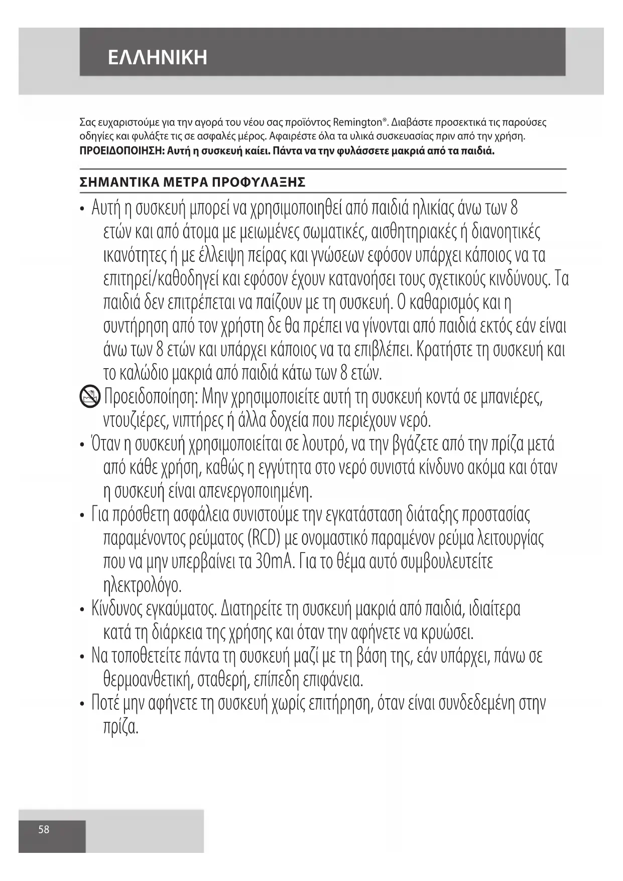 AE58 Σας ευχαριστούμε για την αγορά του νέου σας προϊόντος Remington®. Διαβάστε προσεκτικά τις παρούσες οδηγίες και φυλάξτε τις σε ασφαλές μέρος. Αφαιρέστε όλα τα υλικά συσκευασίας πριν από την χρήση. ΠΡΟΕΙΔΟΠΟΙΗΣΗ: Αυτή η συσκευή καίει. Πάντα να την φυλάσσετε μακριά από τα παιδιά. ΣΗΜΑΝΤΙΚΑ ΜΕΤΡΑ ΠΡΟΦΥΛΑΞΗΣ