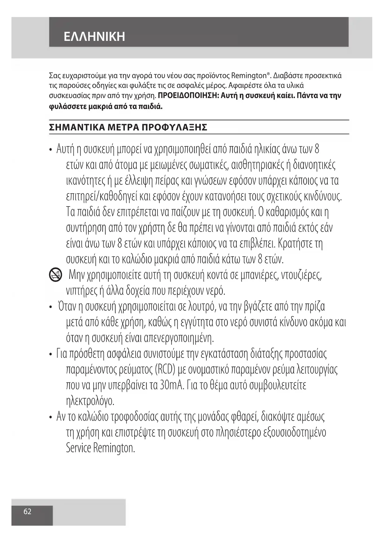 - Αν το καλώδιο τροφοδοσίας αυτής της μονάδας φθαρεί, διακόψτε αμέσως τη χρήση και επιστρέψτε τη συσκευή στο πλησιέστερο εξουσιοδοτημένο Service Remington.63 EΛΛHNIKH