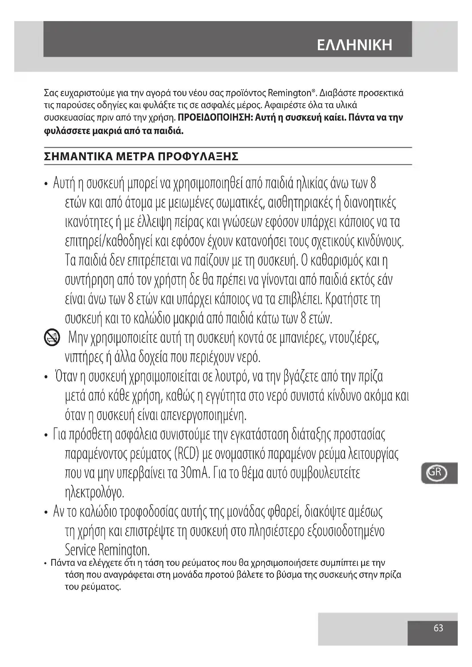 - Αν το καλώδιο τροφοδοσίας αυτής της μονάδας φθαρεί, διακόψτε αμέσως τη χρήση και επιστρέψτε τη συσκευή στο πλησιέστερο εξουσιοδοτημένο Service Remington.