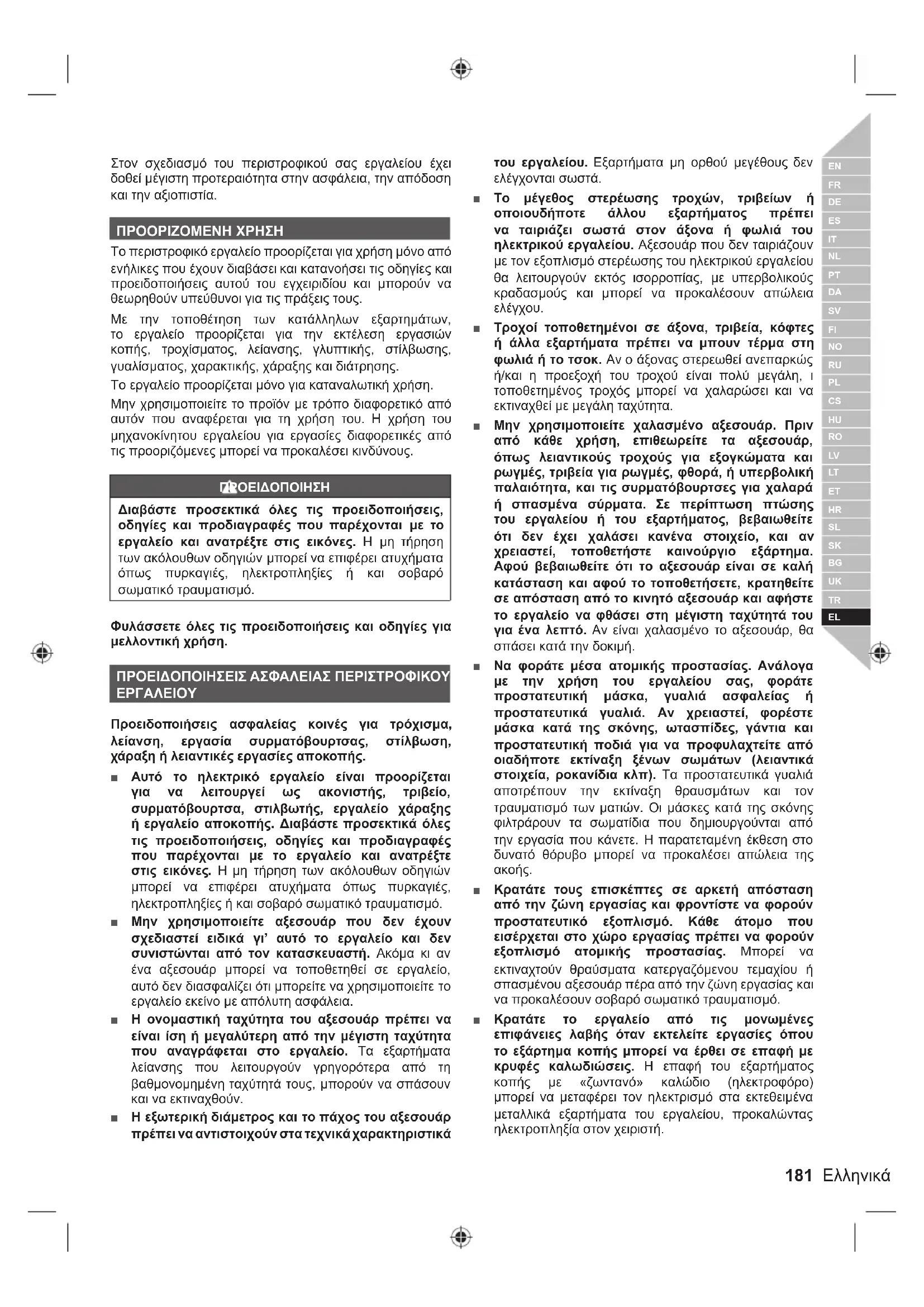 Στον σχεδιασμό του περιστροφικού σας εργαλείου έχει δοθεί μέγιστη προτεραιότητα στην ασφάλεια, την απόδοση και την αξιοπιστία. ΠΡΟΟΡΙΖΟΜΕΝΗ ΧΡΗΣΗ Το περιστροφικό εργαλείο προορίζεται για χρήση μόνο από ενήλικες που έχουν διαβάσει και κατανοήσει τις οδηγίες και προειδοποιήσεις αυτού του εγχειριδίου και μπορούν να θεωρηθούν υπεύθυνοι για τις πράξεις τους. Με την τοποθέτηση των κατάλληλων εξαρτημάτων, το εργαλείο προορίζεται για την εκτέλεση εργασιών κοπής, τροχίσματος, λείανσης, γλυπτικής, στίλβωσης, γυαλίσματος, χαρακτικής, χάραξης και διάτρησης. Το εργαλείο προορίζεται μόνο για καταναλωτική χρήση. Μην χρησιμοποιείτε το προϊόν με τρόπο διαφορετικό από αυτόν που αναφέρεται για τη χρήση του. Η χρήση του μηχανοκίνητου εργαλείου για εργασίες διαφορετικές από τις προοριζόμενες μπορεί να προκαλέσει κινδύνους. ΠΡΟΕΙΔΟΠΟΙΗΣΗ Διαβάστε προσεκτικά όλες τις προειδοποιήσεις, οδηγίες και προδιαγραφές που παρέχονται με το εργαλείο και ανατρέξτε στις εικόνες. Η μη τήρηση των ακόλουθων οδηγιών μπορεί να επιφέρει ατυχήματα όπως πυρκαγιές, ηλεκτροπληξίες ή και σοβαρό σωματικό τραυματισμό. Φυλάσσετε όλες τις προειδοποιήσεις και οδηγίες για μελλοντική χρήση. ΠΡΟΕΙΔΟΠΟΙΗΣΕΙΣ ΑΣΦΑΛΕΙΑΣ ΠΕΡΙΣΤΡΟΦΙΚΟΥ