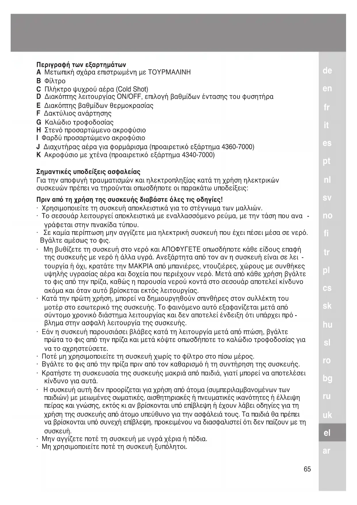 Περιγραφή των εξαρτημάτων A Μετωπική σχάρα επιστρωμένη με ΤΟΥΡΜΑΛΙΝΗ B Φίλτρο C Πλήκτρο ψυχρού αέρα (Cold Shot) D Διακόπτης λειτουργίας ON/OFF, επιλογή βαθμίδων έντασης του φυσητήρα E Διακόπτης βαθμίδων θερμοκρασίας F Δακτύλιος ανάρτησης G Καλώδιο τροφοδοσίας H Στενό προσαρτώμενο ακροφύσιο I Φαρδύ προσαρτώμενο ακροφύσιο J Διαχυτήρας αέρα για φορμάρισμα (προαιρετικό εξάρτημα 4360-7000) K Ακροφύσιο με χτένα (προαιρετικό εξάρτημα 4340-7000) Σημαντικές υποδείξεις ασφαλείας Για την αποφυγή τραυματισμών και ηλεκτροπληξίας κατά τη χρήση ηλεκτρικών συσκευών πρέπει να τηρούνται οπωσδήποτε οι παρακάτω υποδείξεις: Πριν από τη χρήση της συσκευής διαβάστε όλες τις οδηγίες!